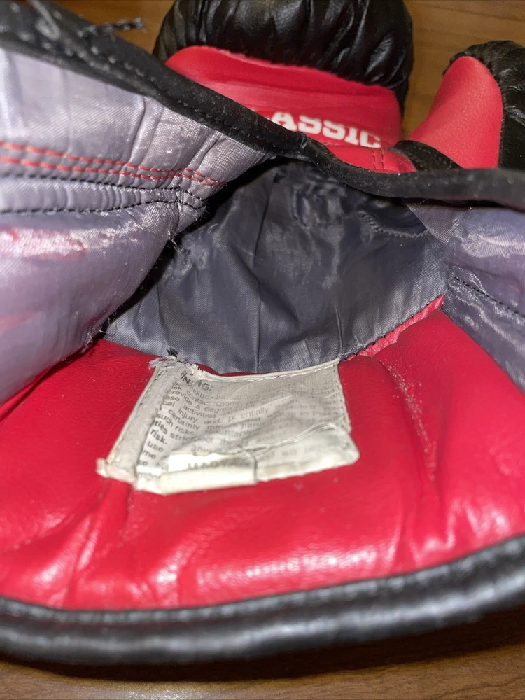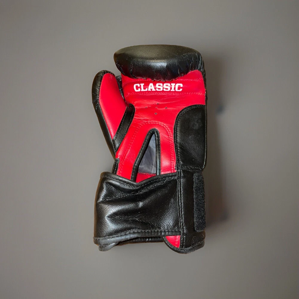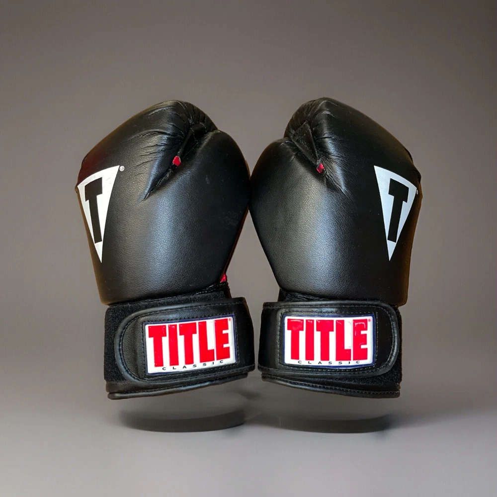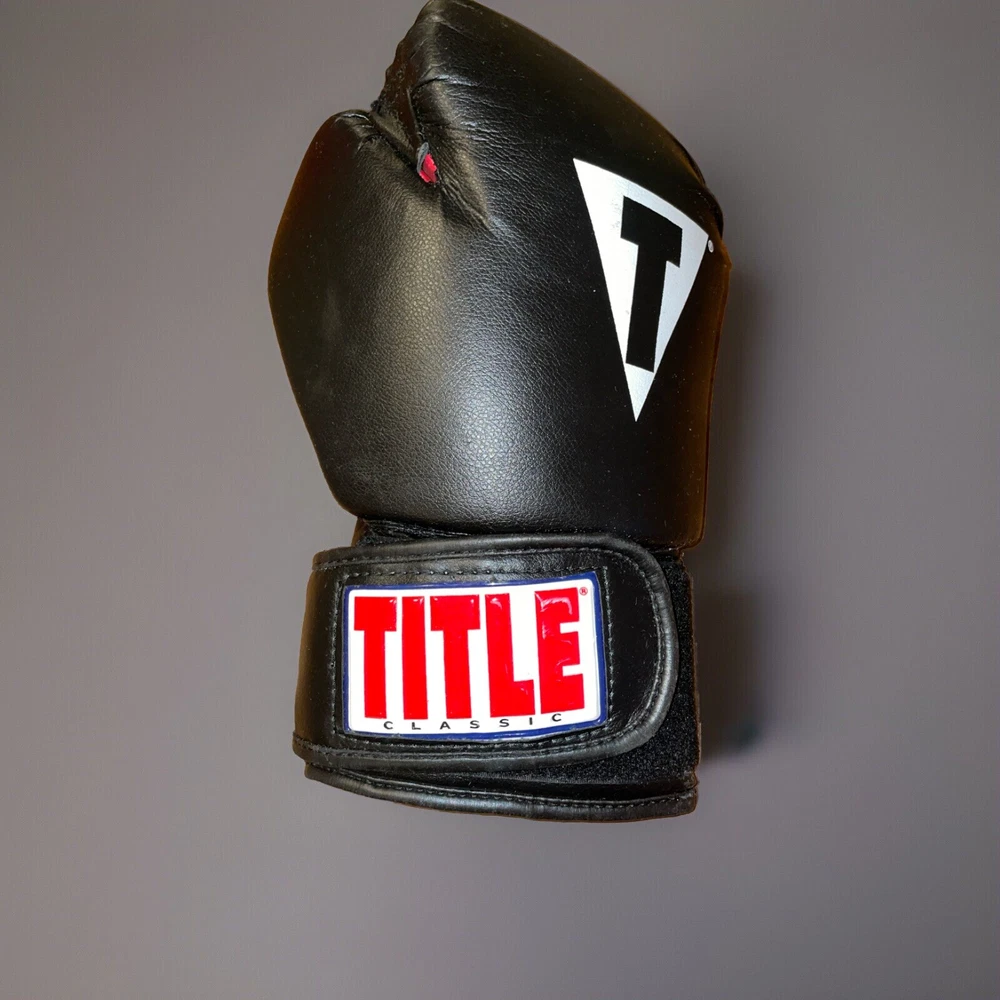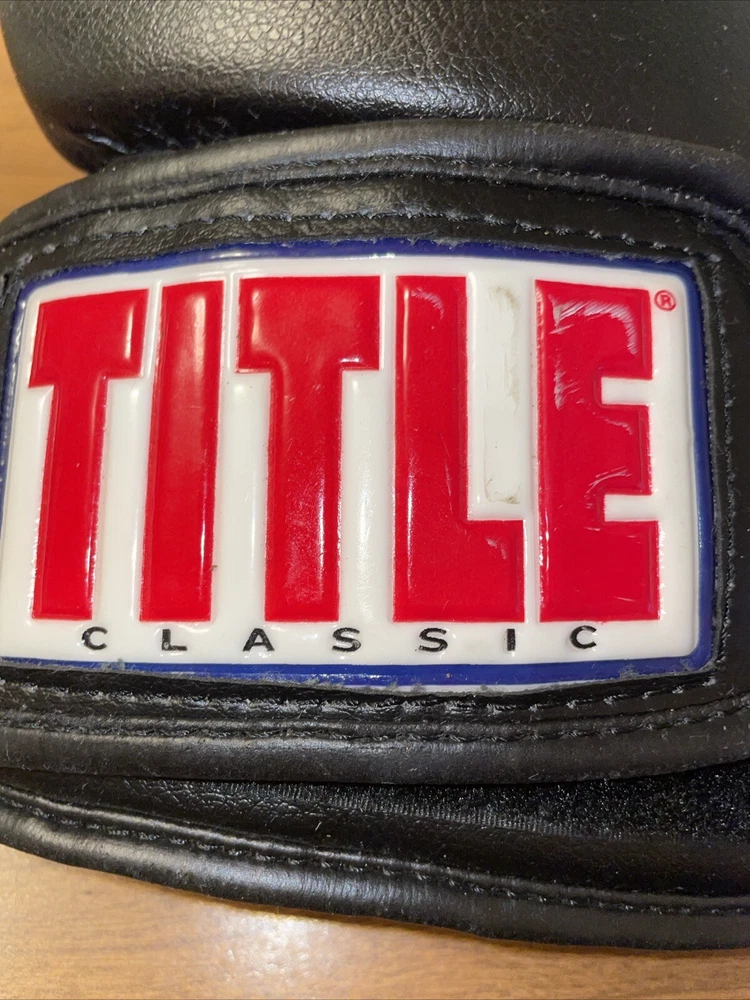 Please note, inside of left glove has a worn spot where inner stuffing is exposed. See photos for details. Title Classic Training Boxing Gloves in black and red, size L, are a well-worn pair that promise to deliver both style and comfort to your boxing sessions. Crafted with care in Pakistan, these gloves are designed for adult unisex use and feature a sturdy 14 oz. weight that's ideal for sparring or heavy bag workouts. The gloves come from the renowned Title Classics brand, known for their quality and durability. With a unit quantity of one pair, they are perfect for boxers looking for a reliable training companion. The gloves' sleek black color with red accents not only look sharp but also offer the functionality and support you need in the ring or at the gym.