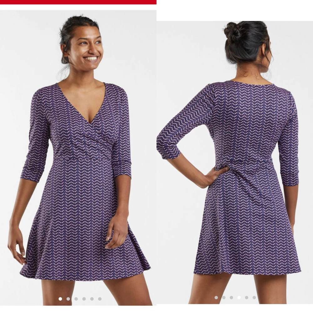 Dress is in excellent condition. There are no notable flaws or signs of wear. Color is purple Pallay Size large - Measurments are approximate and were taken lying flat. Bust 19” Sleeves 17” Waist 16.5” Length 37” Feels like a dream, stays in command of the stage come harsh realities (like laundry done by ten year olds). Made of washable, wicking Buttah™, our soft peached poly/spandex blend. And, it's built with SwiftSnap™: our secret front and center hem snap that delivers instant covert coverage if we up jump the boogie. Wrap-style bust. 3/4 length sleeves. 90% microfiber poly/10% spandex) SwiftSnap™ at hem Two zippered pockets