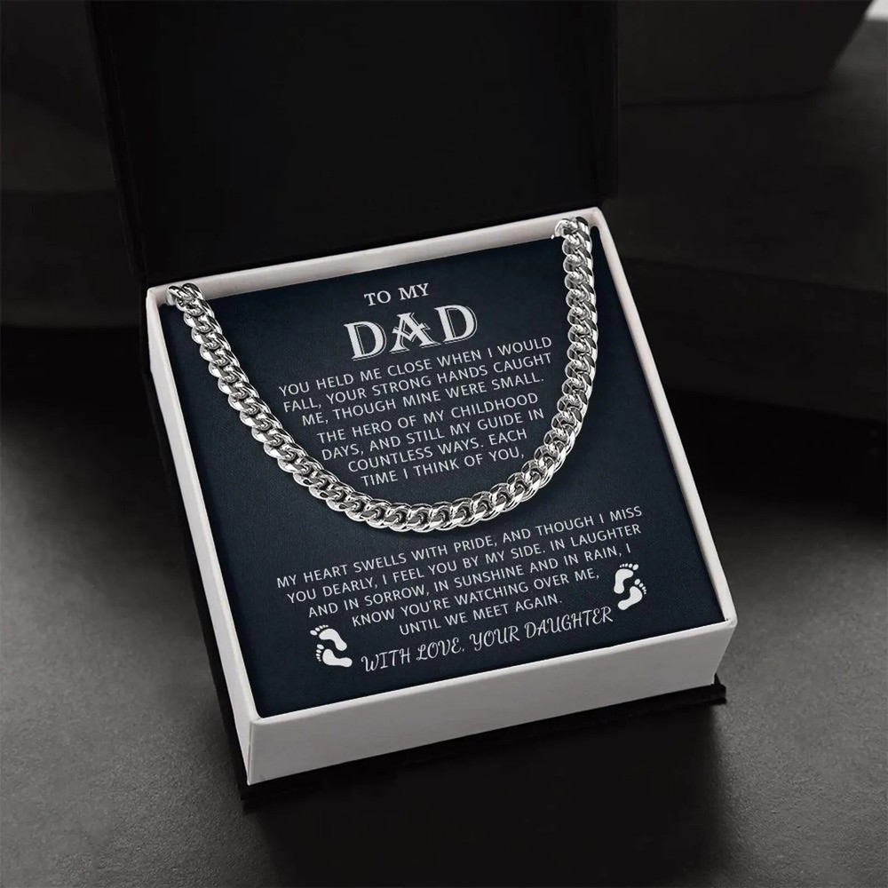 Dad Necklace Gifts, Birthday Gifts, XMas Day Gifts for Dad from Daughter. esigned by FetchTheLove Materials: Stainless steel Gemstone: Cubic zirconia Pendant width: 0.4 Inches; Pendant height: 0.8 Inches; Necklace length: 22 Inches Made to Order Express your love with the Alluring Beauty Necklace – a meaningful heart pendant with a touching message for your daughter. A timeless gift for birthdays or Christmas! Imagine her reaction when she opens this stunning gift! The Alluring Beauty necklace features a petite ribbon shaped pendant that is sure to dazzle your special someone. Whether it's a birthday or anniversary, make sure to get her a gift she will love for years to come. 14k white gold finish or 18k yellow gold finish over stainless steel 7mm cubic zirconia Pendant dimensions: 0.8" (20mm) height / 0.4" (10mm) width Adjustable length: 18" - 22" (45.72 cm - 55.88 cm) Lobster clasp Your piece is lovingly packaged in a complimentary soft touch box for easy gifting. Elevate your presentation by upgrading to the mahogany style luxury box, which features a brilliant LED spotlight