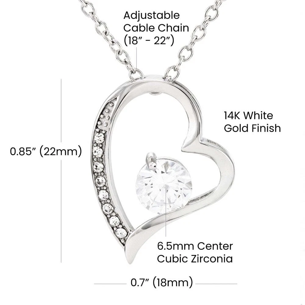 Celebrate timeless love with the Forever Love Necklace , a piece designed to make her heart flutter. This elegant necklace features a radiant 6.5mm round-cut cubic zirconia crystal, beautifully encircled by a polished heart pendant adorned with smaller shimmering crystals for a dazzling finish. Crafted with care, this necklace is available in two exquisite finishes—14k white gold or 18k yellow gold—ensuring a classic, sophisticated look that complements any style. Features: Finish: 14k white gold or 18k yellow gold Center Stone: 6.5mm round-cut cubic zirconia Pendant Dimensions: 0.8" (2.2cm) height x 0.7" (1.8cm) width Adjustable Chain Length: 18"-22" (45.72cm - 55.88cm) with a secure lobster clasp Packaged in a complimentary soft-touch gift box, the Forever Love Necklace is perfect for any special occasion, offering a heartfelt gift she'll treasure forever.