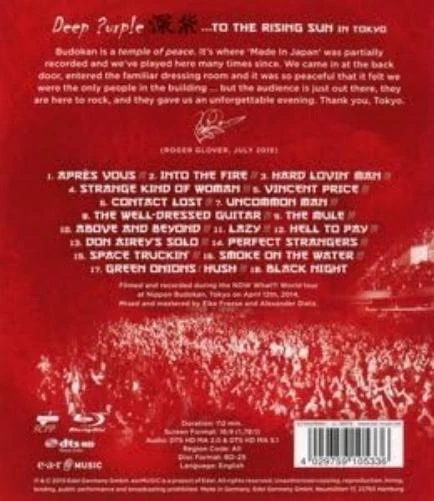 Further Details Title: To The Rising Sun (In Tokyo) Condition: New Format: Blu-ray Description: Product Description: If Wacken shows Deep Purple's performance in front of a huge rock audience, playing as if they had to leave all their habits behind, the Tokyo show is presenting Deep Purple completely at ease with their history and themselves. On the very same venue where the band has written rock history with the album “Made In Japan”, Deep Purple went on stage without nostalgia and with the attitude of a band that is physically led by the music, making playing a perfect show look as the most natural thing one could do. Song after song, Purple play a flawless show going back and forth in time. Deep Purple's many sides are at their best here: the energy but also the groove, the great solo moments by Don Airey and Steve Morse. The soft sides and their energetic heavy counterparts. Filmed by 12 HD cameras and recorded by a top mobile studio, the show offers one of the most magical performances of the NOW What?! tour. Every member of the band is in fantastic form, the band being strong from a full tour together, and the performance seems to be driving the band through the songs as if audience and band were suspended in time. Tracklisting CD1 1. Après Vous 2. Into The Fire 3. Hard Lovin‘ Man 4. Strange Kind Of Woman 5. Vincent Price 6. Contact Lost 7. Uncommon Man 8. The Well-Dressed Guitar 9. The Mule 10. Above And Beyond 11. Lazy CD2 1. Hell To Pay 2. Don Airey’s Solo 3. Perfect Strangers 4. Space Truckin‘ 5. Smoke On The Water 6. Green Onions / Hush 7. Black Night Actor: Don Airey, Steve Morse Rating: G (General Audience) No Of Discs: 1 Run Time: 1 hour and 52 minutes Country/Region of Manufacture: USA, Poland Release Date: 08/28/2015 Studio: earMUSIC Language: English EAN: 4029759105336 Region Code: Blu-ray: B (Europe, AU, NZ, Africa...) Release Year: 2015 Missing Information? Please contact us if any details are missing and where possible we will add the information to our listing.