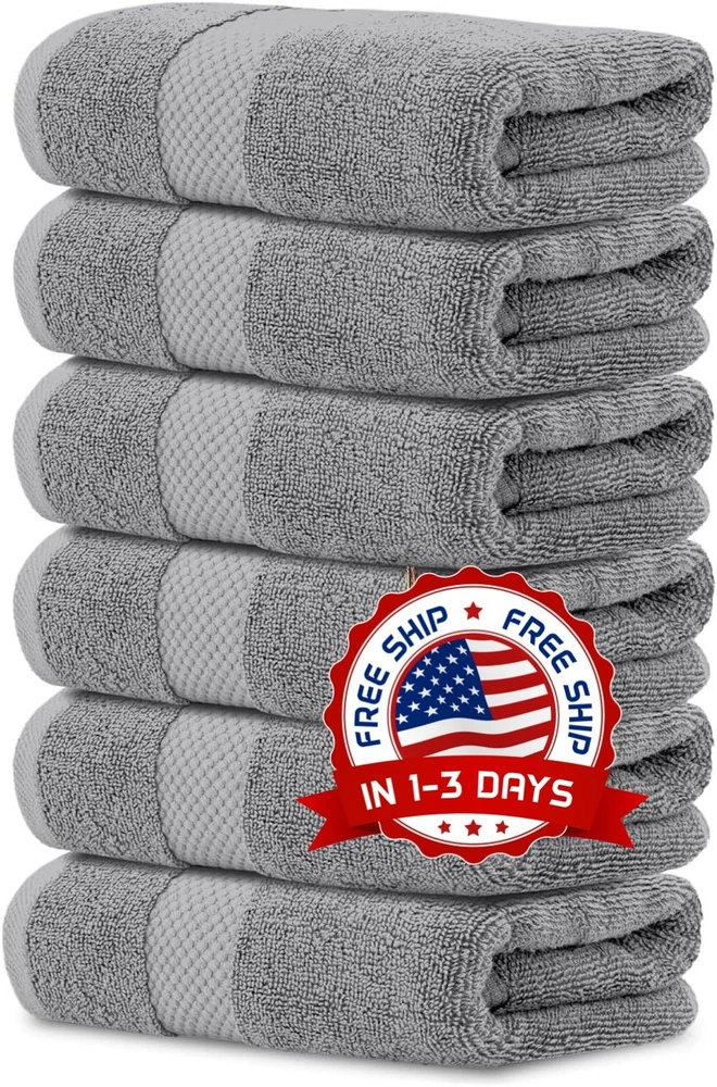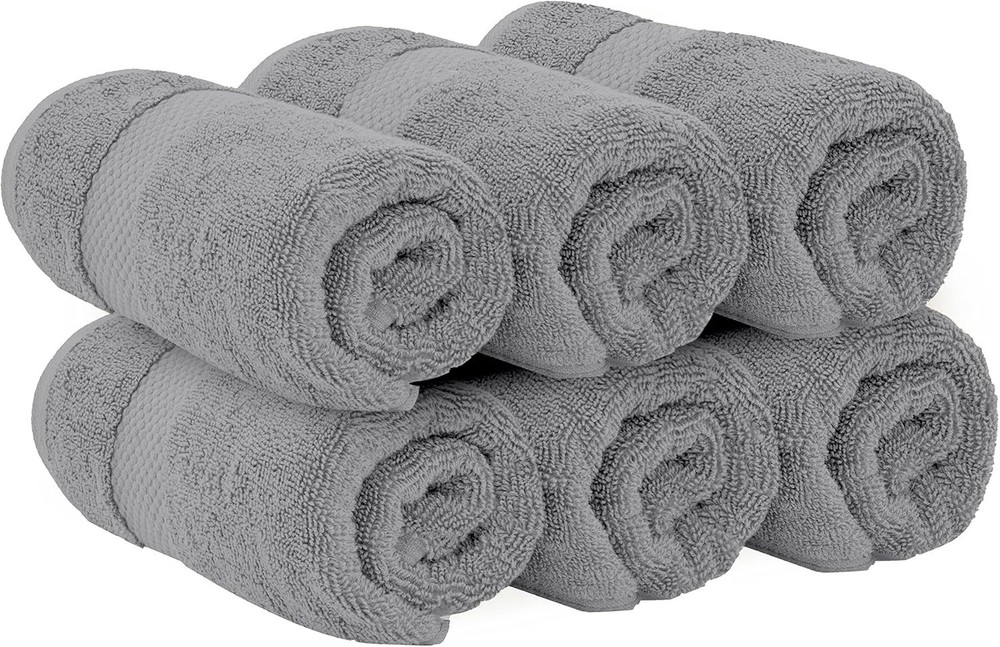 Toallas de mano gris claro, Suaves, 100 % algodón turco, 16" x 30" , Juego de 6 Colección Hotel - Toallas de mano de 6 piezas con un generoso tamaño de 40,6 x 76,2 cm. Cada toalla es 100 % algodón turco: suave, duradera, de secado rápido y con una absorción excepcional. Una sensación de lujo placentera: al final de un largo día o al comenzar uno nuevo, te mereces un poco de lujo. Transforma tu hogar en un santuario y tu baño en un mini spa con la ayuda de estas toallas elegantes, suaves y cómodas. La fabulosa selección de colores hará que tu dormitorio parezca de revista. Experimenta una auténtica sensación de lujo y suavidad en cada uso. Su superficie es lisa y no se deshilacha fácilmente, lo que aumenta su durabilidad. Los bordes están reforzados con doble costura bordada para evitar que se deshilachen con el uso prolongado y los lavados. Perfectas para spas, piscinas, baños, playas, salones de belleza y dormitorios universitarios. Instrucciones de cuidado: simplemente mételas en la lavadora y lávalas. Después del primer lavado, estas toallas se esponjarán maravillosamente y se sentirán frescas y suaves. Estas toallas están especialmente procesadas para que la secadora tarde menos, ahorrando así tiempo y energía. Mantenga limpio el filtro de pelusa. Es posible que se observe algo de pelusa en el primer lavado. Esto no afectará la apariencia, el tacto ni el rendimiento de la toalla.