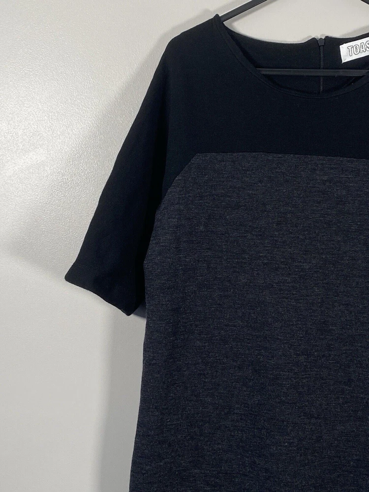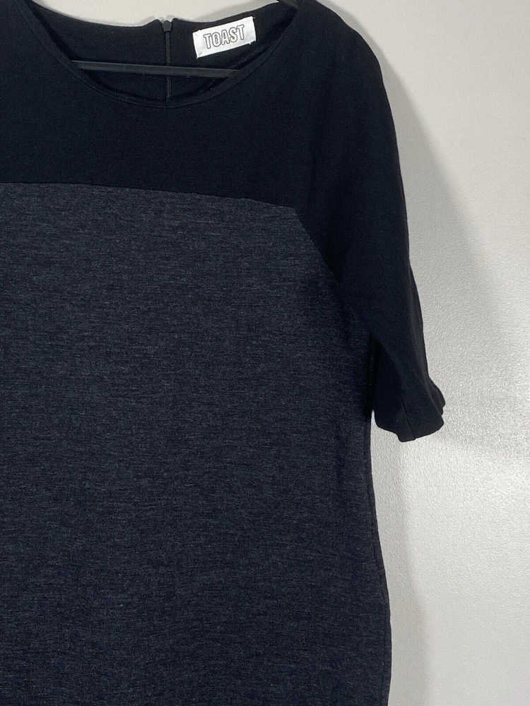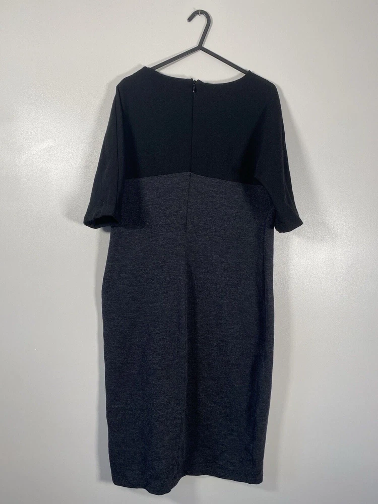 This stunning Toast midi dress in black and grey is made from a soft wool blend and features a unique colourblock pattern. The boat neck and asymmetrical half sleeve add a touch of elegance to this fitted bodycon tunic. The dress is easy to wear with a zip closure and stretch fabric, making it perfect for any occasion, be it a wedding, holy communion, party, casual outing, or formal business event. The dress has been crafted with care and features button accents and the Toast logo. The quality is reflected in the dress's design. The dress is easy to maintain with hand wash only care instructions. This size 10 regular dress is perfect for any woman looking for a stylish and comfortable outfit. Please compare the below measurements to your favourite dress to ensure the best fit. Pit to pit - 17 inches Chest - 33 inches Waist - 34 inches Hips - 37 inches Length - 40 inches I look forward to sending it to you.