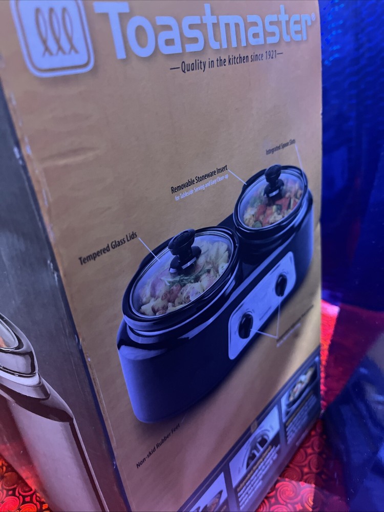 The Toastmaster TM-225BS Slow Cooker offers double cooking versatility with two 2-2.5 quart pots. It features adjustable settings, an electric power source, and comes with a lid. This slow cooker is designed for home use and is manufactured in China. It includes a 1-year manufacturer warranty.