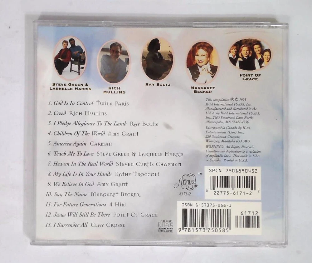 1 Twila Paris– God Is In Control 2 Rich Mullins– Creed 3 Ray Boltz– I Pledge Allegiance To The Lamb 4 Amy Grant– Children Of The World 5 Carman– America Again 6 Steve Green* & Larnelle Harris– Teach Me To Love 7 Steven Curtis Chapman– Heaven In The Real World 8 Kathy Troccoli– My Life Is In Your Hands 9 Amy Grant– We Believe In God 10 Margaret Becker– Say The Name 11 4Him– For Future Generations 12 Point Of Grace– Jesus Will Still Be There 13 Clay Crosse– I Surrender All