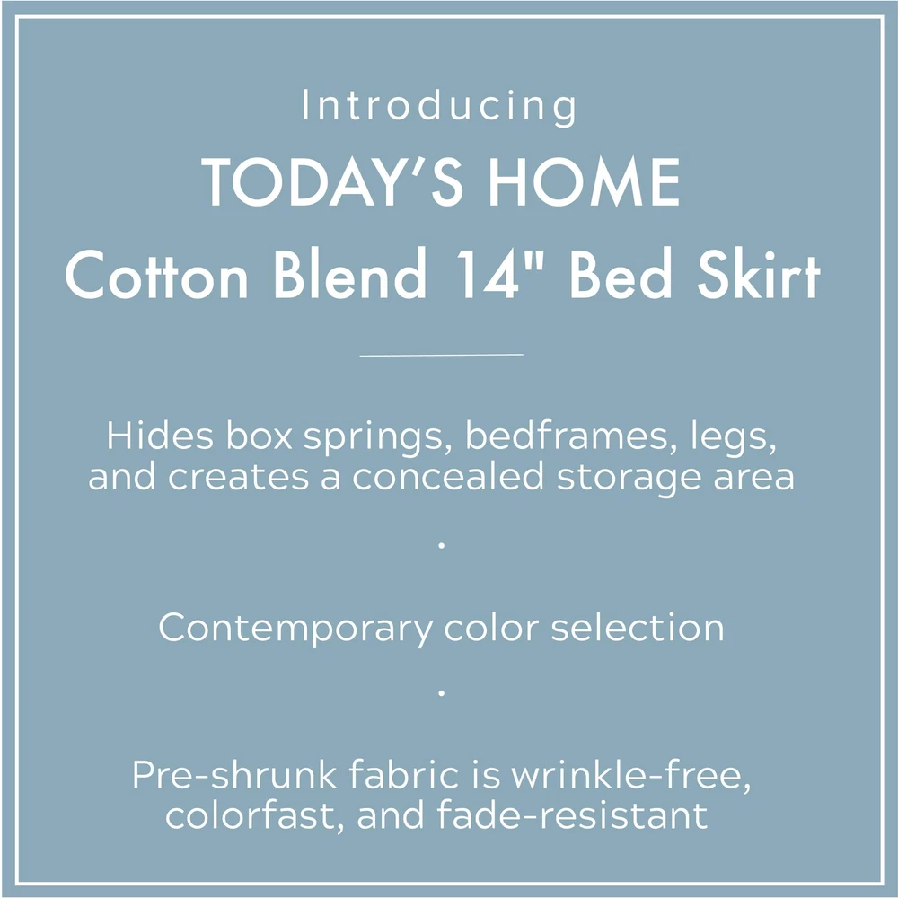 Let’s face it, a bed doesn’t look fully pulled together without a bed skirt. Today’s Home Classic Tailored Bed Skirts are not only a decorative finishing touch, but they are also made for use. Made from a sturdy cotton/poly blend, they are both wrinkle and fade resistant. The bed skirt gives your decor a finished look while hiding any bins or other things stored under your bed. The classic design is both modern and timeless, and will also hide bed frames and legs. That means our dust ruffles look just as good with your grandmother’s quilt as they do with a patterned duvet that goes over your down comforter; they’re an accent that grows with you and your changing décor. The right finishing touch is always down to the details. Let Today’s Home help complete your finished room. Quick Tip: To remove any wrinkles, place the bed skirt in the dryer for five minutes with a damp washcloth on high heat. reduced the size of our packaging to leave less of a carbon footprint. Timeless Design: Our tailored design features split corners for easy placement around bed posts for a clean and classic look that will match any style of bedding and room decor Specifications: The queen-size fits all queen beds and measures 60 x 80 inches with a 14 inch drop length Fresh Look: Our bed skirts are made from a 60% Cotton/40% Polyester blend and are machine washable. This fabric blend is pre-shrunk, wrinkle resistant, fade resistant, and extremely durable for years of use Hidden Storage: Our bed skirt hides box springs, bed frames, and legs that you’d rather not be visible. The sleek design allows you to tuck things under your bed and keep them out of sight Always in Style: The classic design of this bed skirt adds the perfect finishing touch to your bedding set and will coordinate with any current and future trends Packaging may vary
