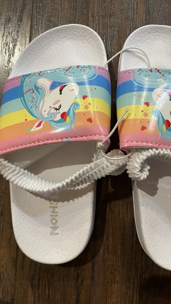 These toddler girl sandals in size 9 feature a cute unicorn design in white with straps for easy slip-on closure. Perfect for travel, parties, or casual outings, the sandals offer moderate cushioning with a rubber outsole for comfort. The synthetic upper material and lining make them durable and easy to clean, while the theme of unicorn and rainbow adds a fun and playful touch to your child's summer, fall, or spring wardrobe.