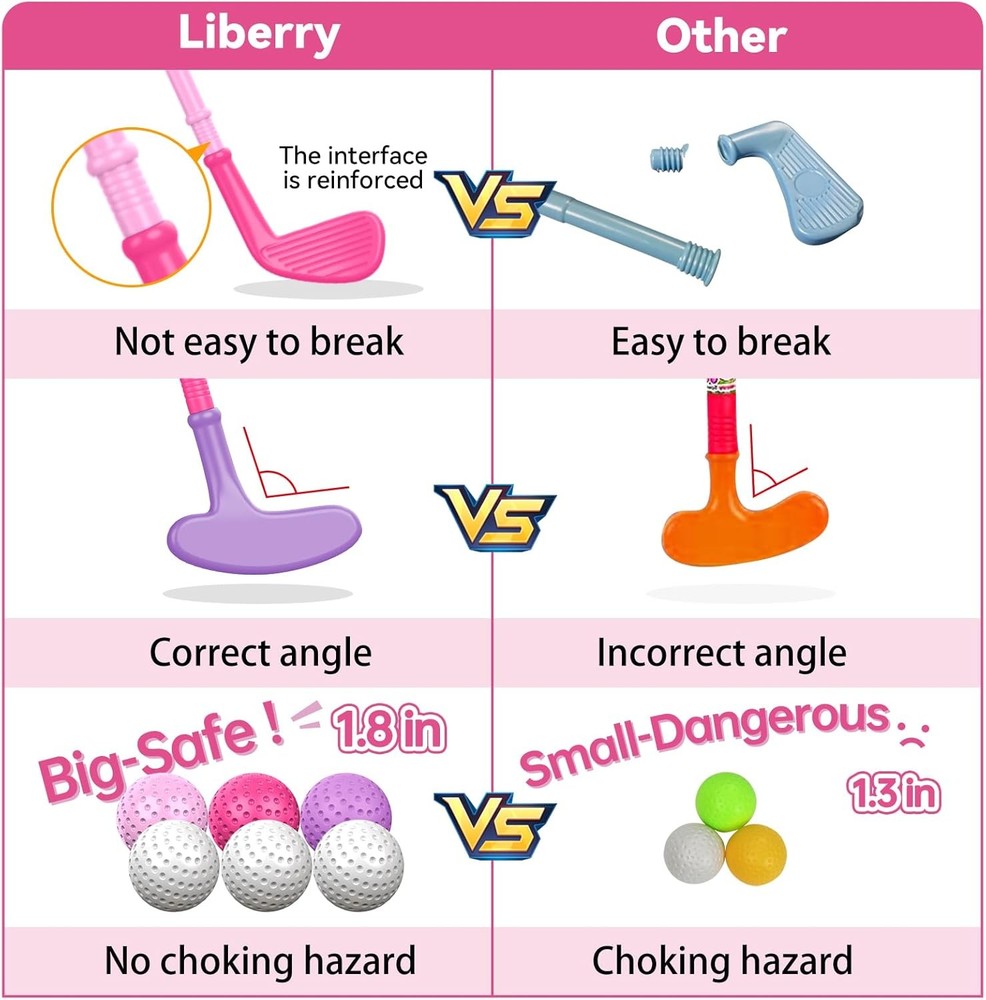 Liberry Toddler Golf Set with Putting Mat for 2 3 4 Years Old Boys Girls, Upgraded Kids Golf Cart with Unique Shoulder Strap Design, Indoor and Outdoor Golf Toys Gifts (Pink) SAFE AND DURABLE: The latest kids golf set is made of high-quality plastic, odorless and no sharp edges or burrs. The clubs have enhanced hardness and are not easily broken. Plus, our golf balls are larger (1.8 inches), it can effectively avoid choking hazards WELL-DESIGNED AND PORTABLE: Our kids golf cart comes with a retractable handle and flexible wheels, allowing it easy for toddlers to pull. The large golf cart can keep all accessories together to ensure they don't get lost. Besides, unique strap design makes it easier for kids to carry REALISTIC GOLF EXPERIENCE: Our toddler golf set provides a more authentic golf experience for beginners. The plastic golf clubs are not only the appropriate length and weight for toddlers, but the angle is also closer in appearance to real golf clubs. We have added a practice mat that kids can hit the ball according to the trajectory of the putting mat and experience the fun of golf indoors EDUCATIONAL SPORTS TOY: Our kids golf club set can be used indoors and outdoors. The colorful and fun toddler golf clubs help to develop kid's observation, judgment, hand-eye coordination, and patience. A great gift for little golfers aged 2-4 GREAT TOY GOLF SET: Liberry baby golf set includes 1 golf cart, 1 golf mat, 3 golf clubs (putter, iron, and wood. putter and iron are also left-handed compatible), 2 holes, 2 flags, 2 golf tees, and 6 balls (3 white and 3 colorful). Recommended Height: Under 3'5" (105 cm) Retractable Rod Design The height can be adjusted from 14.5 to 22 inches, suitable for toddlers of different heights Unique Shoulder Strap Design We have added a unique shoulder strap design, your little one can carry with ease Hidden Hole Design Innovative Hidden Hole Design Saves Space and Makes Storage a Breeze! Different Putting Distance Help children to master the putter strength by practicing different putter distances and learn golf skills better
