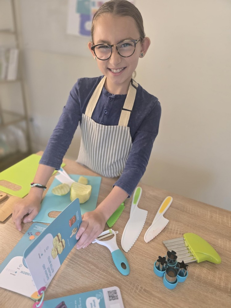 Comprehensive Kids Cutting Set: Includes 4 kid-safe knives (3 serrated and 1 straight edge), 2 cutting boards, safety gloves, a peeler, 4 vegetable shape cutters, a crinkle cutter, and a wooden chopper. Safe and Kid-Friendly Design: Our knives and tools are designed for kids and toddlers, ensuring worry-free cutting and learning. Perfect for building culinary skills safely Engaging and Educational: Transform mealtime into magical moments with our fun visual recipe card booklet. Kids will love creating healthy, easy-to-make recipes on their own. Premium Quality Materials: Durable, reliable tools that stand the test of time. Made from high-quality materials that ensure long-lasting use and safety. Perfect Gift for Young Chefs: Ideal for children aged 4 and up, this all-in-one kit makes a thoughtful and memorable gift, inspiring a lifelong love for cooking.