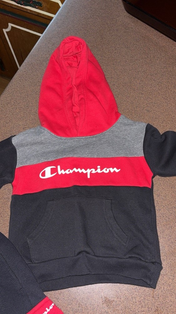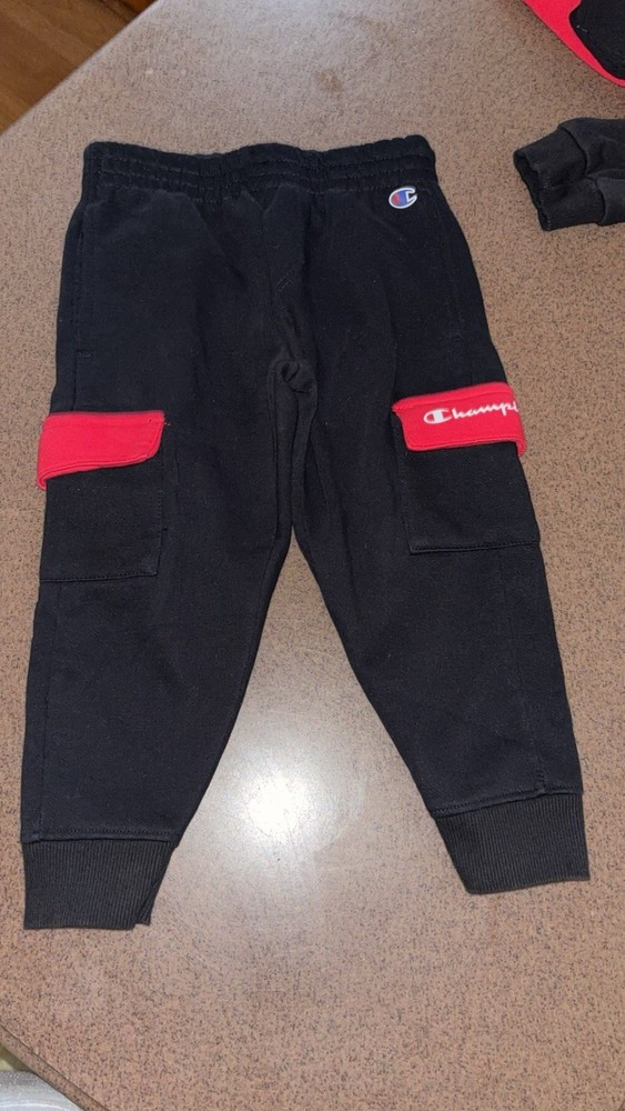 The Champion Toddler 2 Piece Sweatsuit in size 3T is a red polyester outfit set perfect for active young boys. This long-sleeve pants set features a solid color with a sporty theme, making it suitable for casual or activewear occasions. The set includes a logo accent on the pants, and it is machine washable for easy care. Ideal for winter, fall, or spring seasons, this Champion outfit is designed for comfort and style for active toddlers.