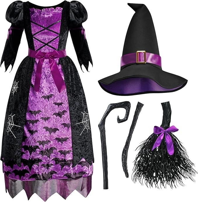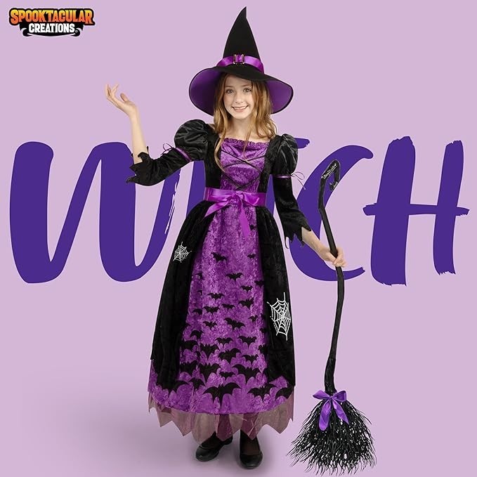 About this item Purple Witch Costume for Girls Deluxe Set. Includes Witch’s Matching Hat, a Long-Sleeved Dress, a Belt and a Broom. Girls Fairy Tale Witch Costume. Super durable and made with care. 100% Polyester. Super Value for Role Play. Great for Halloween Dress Up Parties, Fairytale Witch Themed Parties, Children's Witch Costume, Cute Witch, Witch Costumes for Girls, Fairytale Costumes for Girls, Good Witch Costume for Girls, Halloween Costume Dress Up, Fairytale Witch Role Playing, Activity, Everyday Play and More! Safety Test Approved. Easy to Wear, Unique Halloween Costume for Fairytale Witch Role Playing, Birthday Party, Costume Halloween Party. Instaworthy Halloween Costume Contest Idea! Add Lots of Fun to Your Halloween Party and Other Theme Activities! Size: Toddler (3– 4yrs), Small (5–7yrs), Medium (8-10yrs)