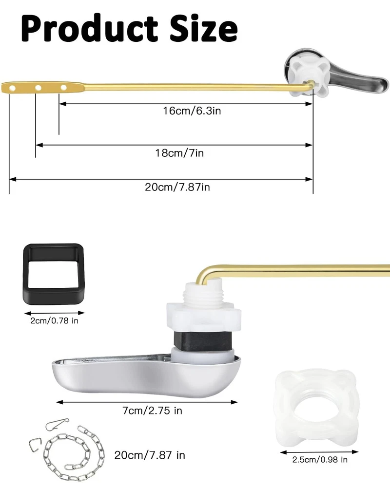 Toilet Handle Replacement Kit Universal Toilet Flush Handle, Zinc Alloy Toilet Tank Trip Lever with H2 Brass Arm, Compatible with American Standard/Mansfield Toilet [High-Quality Materials] Crafted from chrome-plated zinc alloy and an H62 brass arm, this toilet lever boasts exceptional hardness, wear resistance, corrosion resistance, and rust-proof qualities. The toilet handle's sleek, glossy finish adds a touch of high-quality elegance. [Easy Installation] Designed for hassle-free installation, the front-mounting bracket of this toilet flush lever doesn't require any tools. Easily replace your toilet handle with our user-friendly kit, perfectly adjustable to fit your toilet. [Front-Mount Toilet Tank Lever] This front-mount toilet tank lever handle design suits most standard toilets, with the lever's end featuring three holes for flexible length adjustments to match your toilet tank perfectly. [Perfect Replacement] Effectively replace damaged or rusted toilet handles, resolving flushing problems. This beautiful, high-quality accessory not only enhances your bathroom's aesthetics but also revitalizes your old toilet. [User-Friendly Design] The chrome toilet handle is also suitable for children, and the elderly since the control lever is designed with user-friendliness in mind, allowing for easy use without applying too much pressure. And also making it a perfect addition to any family bathroom. [Package Contents] 1 x Toilet handle lever, 1 x H62 brass arm, 1 x rubber pad, 1 x fixing gear, 1 x stainless steel flapper chain. [Toilet Flush Lever Dimensions] The included handle wrench is about 7cm/2.75 inch, the lever is about 20 cm / 7.87inch , and stainless steel flapper chain is 20 cm/7.87 inch long. Shipping We offer FREE shipping on all orders! We ship within Three business days of payment, usually sooner. We use a selection of shipping services such as UPS, FedEx, USPS etc. We only ship to the lower 48 states, no APO/FPO addresses or PO Boxes allowed. Local pickups and combined shipping options are not provided at this time. Return You can return a product for up to 30 days from the date you purchased it. Any product you return must be in the same condition you received it and in the original packaging. Please keep the receipt. Payment We accept payment by any of the following methods: PayPal Please pay as soon as possible after winning an auction, as that will allow us to post your item to you sooner! Feedback Customer satisfaction is very important to us. If you have any problem with your order, please contact us and we will do our best to make you satisfied. Contact Us If you have any queries, please contact us via ebay. We usually respond within 24 hours on weekdays. Please visit our eBay store to check out other items for sale! Thank you for shopping at our store.