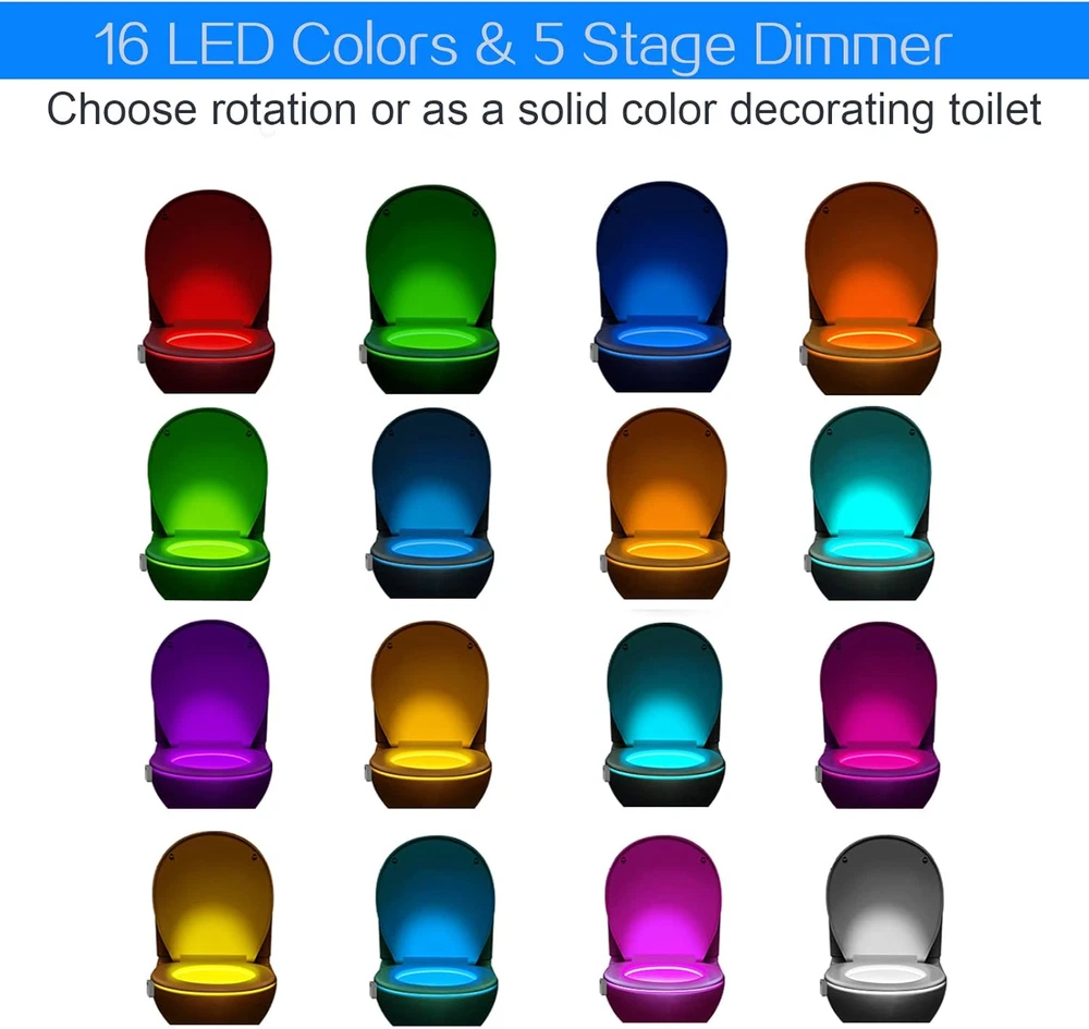 Store New Arrivals Add to Favorite View Feedback Contact Toilet Light Motion Sensor Activated 4Pack, Rechargeable Color Changing LED Night Lights inside Toilet Bowl, Cool Gadgets for Bathroom Accessories, Unique Stuff for Men and Kids Birthday Description Light Source Type LED Style Modern Number of Items 4 Power Source Battery Powered Number of Light Sources 1 Country of Origin China Batteries Included? Yes Lighting Method Adjustable Mounting Type Tabletop Maximum Compatible Wattage 2 Watts Controller Type Push Button, Motion Activated, Light Detection Room Type Bathroom Lamp Type Mood Light Product Dimensions 0.78"D x 2.16"W x 2.82"H Material Acrylonitrile Butadiene Styrene Batteries 1 Lithium Polymer batteries required. (included) Collection Toilet Lights Motion Detection Installation Type home decor Finish Type Polished Specific Uses For Product Bathroom Night Light Indoor/Outdoor Usage Indoor Brightness 20 Lumen Control Method Touch Water Resistance Level Waterproof Batteries Required? Yes Item Weight 0.18 Pounds Connectivity Technology USB Special Features Dimmable, Rechageable & Waterproof, 3-way switching Special Feature Dimmable, Rechageable & Waterproof, 3-way switching Bulb Base E5 Shade Color White Color Temperature 5000 Kelvin Color White Is Cordless? Yes Base Material Plastic Is Waterproof true Shape Square Voltage 3.7 Volts Recommended Uses For Product Decoration Shade Material Acrylonitrile Butadiene Styrene Finish types Polished Included Components rechargeable toilet bowl right 4packs Switch Type Push button & Motion Sensor & Light Detection MOTION-ACTIVATED SENSING FOR NIGHTTIME SAFETY: Equipped with a high-quality dusk-to-dawn sensor and motion detector, this LED toilet night light automatically illuminates when movement is detected. It stays on for 2 minutes after the last detection, ensuring your kids can navigate safely in the dark without stumbling 16 COLOR-CHANGING GLOW INSIDE TOILET: Customize your bathroom experience with 16 vibrant colors that can either rotate or stay fixed on your favorite hue. The 5-stage dimmer allows for adjustable brightness, making it perfect for toddlers, teens, and anyone who loves a lighted toilet seat and bathroom decor RECHARGEABLE & WATERPROOF DESIGN: Powered by a 1000mAh USB rechargeable battery, this flexible-arm things fits any toilet bowl rim or anywhere needed in the house or apartment. The waterproof design makes it easy to clean with household cleaners, making it an essential or must have home gadget for men, husbands, and anyone who appreciates convenience UNIQUE & FUN GIFT IDEA: Looking for a silly yet practical gift? This motion-activated stuff is the perfect novelty gift for birthdays, Christmas, or white elephant parties. Ideal for anyone with a sense of humor, this tech gadget is sure to bring a gag laughter and light to any room WHAT’S IN THE BOX?: Your purchase includes 4 motion sensor toilet nightlights, 4 USB charging cables, and easy-to-follow instructions. Packaged in 4 separate gift-ready box, it’s perfect for dads, moms, brothers, sisters, boyfriends, or as a housewarming present Product Description Funny Bathroom Decor Lighting 4Pack 16 LED Colors Changing: Dazzle your bathroom with a rainbow glow 16 Colors Motion Activated Rechargeable is Better than 8 Color Battery Powered Cool and Useful Smart Gift Idea for All Ages (Men most wish for) Must have gadget that brings life a lot of fun The toilet is a great place to relieve stress, and now you can make it even easier with the Toilet Night Light. This motion activated LED light will illuminate your bathroom so you can relax after a long day. The soft PVC neck can be bent easily to conform to any toilet type. It has 16 colors that you can choose from, so you'll never get bored. Features: Latest Waterproof Protection 100%: Keep the rechargeable toilet light working well no matter you’re getting it into water. Longest Usage: Up to 180 days on singe charge, longer use than other toilet night lights. Rechargeable: Energy saving No tools, screws are required. Save your money, say goodbye to weekly battery. 16 LED Colors: Choose the color you like that fits your mood. Motion Activated: Lights up in the dark. What You Receive: 4* Toilet Lights, 4* USB Cable,4* User Manual, in 4 separate color box packaging. How to set the colors? By default, the unit comes in"carousel mode" means it will cycle through all 16 colors(1 color every 8 seconds) Short press and release the button when your desired color appears, it will fix the current color, press again to go on changing color How to set the brightness? Dimmer:Keep press and hold the button (3 seconds) to adjust 5 stages of brightness from high to low, release the button when your desired brightness appears. Keep pressing again to adjust from low to high brightness. What is the range of motion sensor activated toilet night light? It only works at night, light detection sensor prevents daytime or unnecessary illumination. It detects movement in 18 feets and 170 degree if no block infront of the sensor, auto glows up and stays 2 mins. What is different with other toilet light? Upgrade rechargeable? It is the newest version upgrade USB rechargeable, builded in capacity 1000mAh lithium battery strong endurance. Lasts up to 180-day on a single charge. ENERGY SAVING No need battery exchange More Choices for Witshine Night-lights Related Product Add to Cart Add to Cart Add to Cart Add to Cart Add to Cart Add to Cart Add to Cart Customer Reviews 4.6 out of 5 stars 519 4.5 out of 5 stars 4,956 4.4 out of 5 stars 4,754 4.4 out of 5 stars 3,328 4.5 out of 5 stars 1,659 4.5 out of 5 stars 922 4.8 out of 5 stars 36 Price $31.99 $ 31 . 99 $18.99 $ 18 . 99 $12.95 $ 12 . 95 $9.99 $ 9 . 99 $12.49 $ 12 . 49 $15.89 $ 15 . 89 $39.99 $ 39 . 99 Brand Witshine Witshine Witshine Witshine Witshine Witshine Witshine Features 16 Color motion activated 16 Color motion activated 16 Color motion activated 16 Color motion activated 16 Color motion 