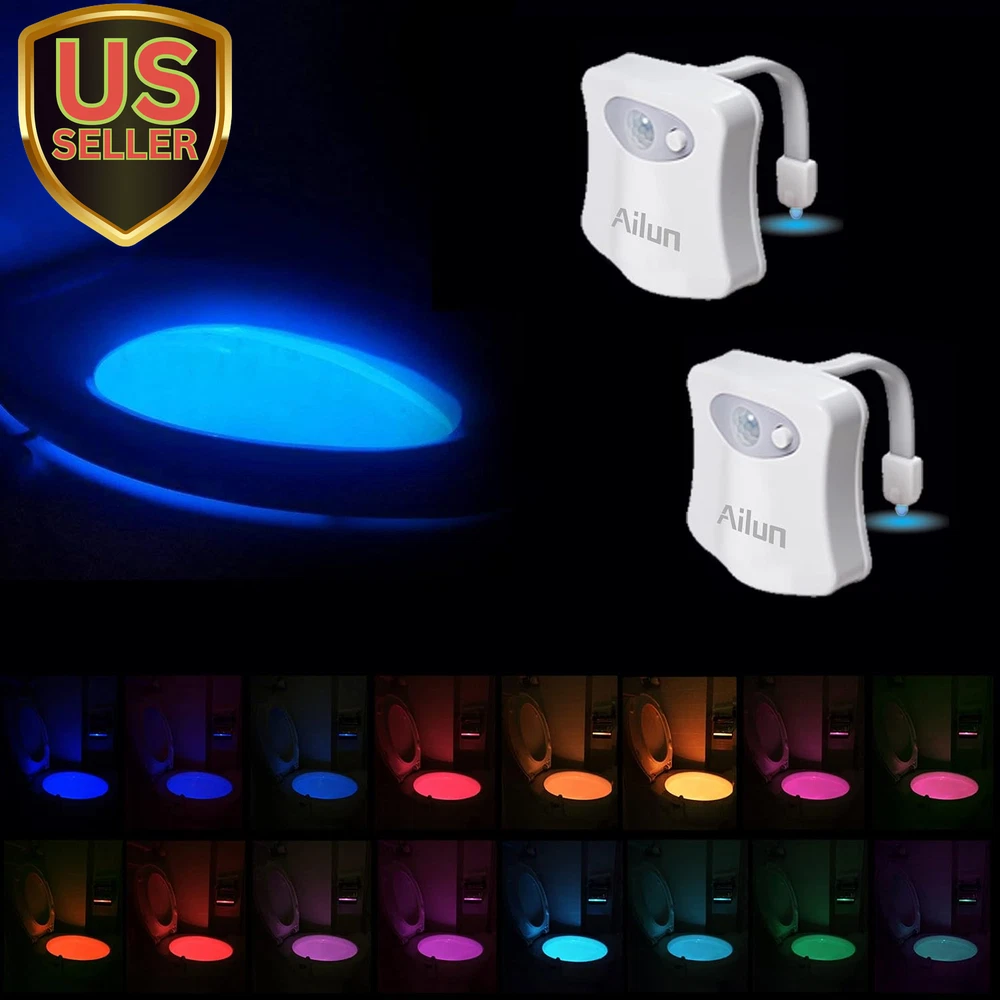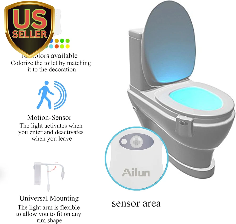 Store New Arrivals Add to Favorite View Feedback Contact Toilet Night Light Motion Activated LED Light 16 Colors Changing Toilet Bowl Illuminate Nightlight for Bathroom Battery Not Included Perfect Decorating Combination with Faucet Light [2 Pack] Description Item model number ToiletNightLight 16Colors 2P Light Source Type LED Style Art Deco Number of Items 2 Power Source Battery Powered Number of Light Sources 1 Country of Origin China Batteries Included? No Lighting Method Up/Down Light Lamp Type Night Light Number of Pieces 2 Room Type Bathroom Efficiency Energy Efficient Product Dimensions 2.91"D x 4.72"W x 2.28"H Material Plastic Batteries 3 AAA batteries required. Installation Type Tabletop Controller Type Push Button Is Discontinued By Manufacturer No Specific Uses For Product Toilet Item Package Quantity 2 Indoor/Outdoor Usage Indoor Water Resistance Level Water Resistant Batteries Required? No Item Weight 3.52 ounces Connectivity Technology USB Special Features Motion-Sensor Special Feature Motion-Sensor Shade Height 2.28 Inches Part Number ToiletNightLight 16Colors 2P Shade Color Multicolor Mounting Type Tabletop Color White Is Cordless? Yes Base Material Plastic Is Waterproof True Shape Bulb Voltage 4.5 Volts Recommended Uses For Product Decoration Shade Material Plastic Included Components Battery Switch Type Push Button [2 Pack] The pack includes two nightlights in total and was packed in one Package. Designed with a soft and flexible PVC neck that can be bent easily to conform to any toilet type, regardless of the shape of the bowl. Motion-Activated LED Sensor: The LED Toilet Light with high quality light sensor and motion sensor, it will automatically turn on when detects movement and stay on for 2 minutes after last movement, protecting your kids from stumbling around in the dark. Ultra-water resistant and can be cleaned with most household cleaners. No more messy cleanups! It is a dream to find your way easily and safely without any worries, the choice of modern life. Creative lighting design: Choose between 16 single colors or color-cycle, this toilet night lamp is going to make your toilet beautiful and easy to use at night. You can keep One Color or Color Rotation on this bowl of light. Easy to Install and Clean: Operated by three AAA batteries(1.5V)(Battery not included), which can be easily get and change. Simple design makes it easy to clean. Product Description Product Description Add to Cart Add to Cart Add to Cart Customer Reviews 4.4 out of 5 stars 1,764 4.3 out of 5 stars 39,098 4.4 out of 5 stars 6,988 — 4.1 out of 5 stars 1,085 Price $13.89 $ 13 . 89 $9.89 $ 9 . 89 $14.99 $ 14 . 99 — — Brand Ailun Ailun Ailun Ailun Ailun Color 16 Colors 8 Colors 8 Colors 16 Colors 8 Colors Quantity 2 Pack 2 Pack 3 Pack 1 Pack 1 Pack Battery type three AAA batteries three AAA batteries three AAA batteries three AAA batteries three AAA batteries Features Ultra-water resistant Motion Activated Motion Activated; Easy clean Ultra-water resistant Motion Activated The video showcases the product in use. The video guides you through product setup. The video compares multiple products. The video shows the product being unpacked. 1. How do set the color? Press the modes switch button to set single color mode when the most desired color is visible,press it again to put it back on color rotation mo