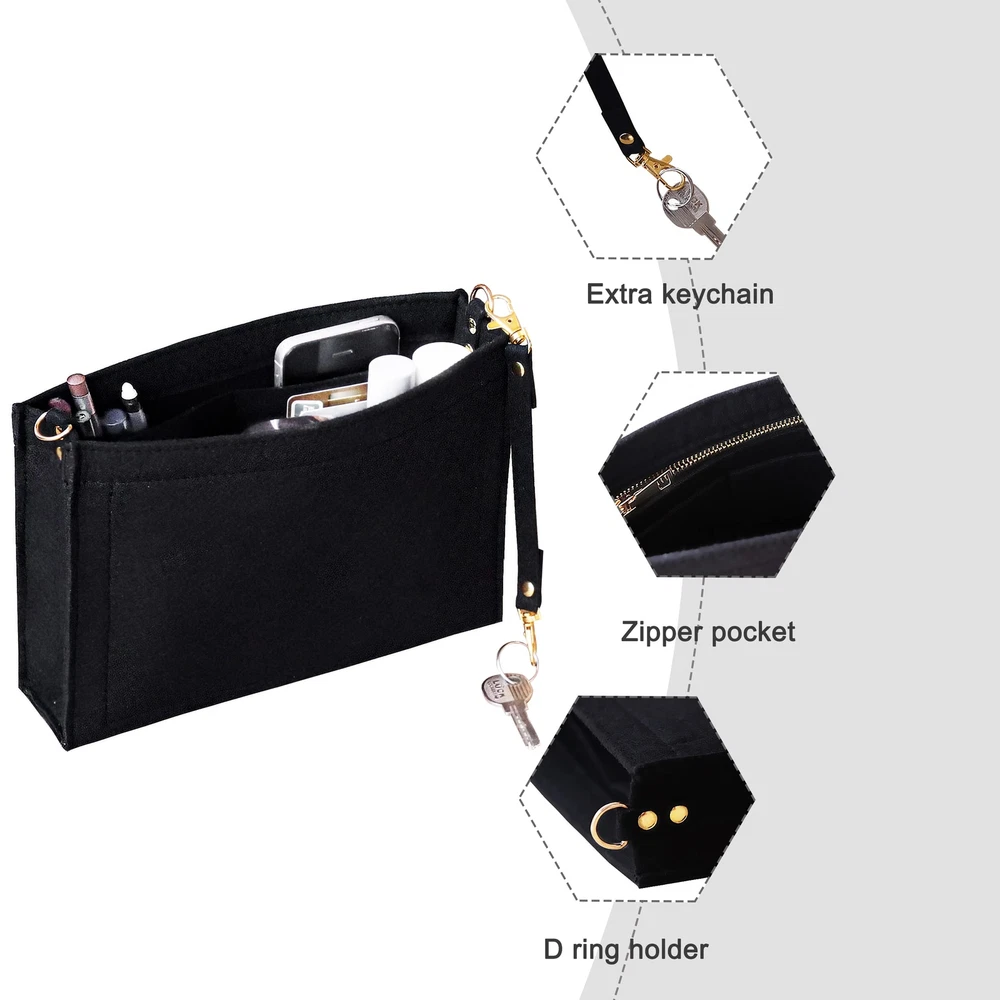 【 LIGHTWEIGHT & DURABLE】The Toiletry Pouch Handbag inserts organizer is made of felt which is exquisitely made,good sewing, pliable and sturdy. Lightweight handbag organizer does not increase the weight of the bag. 【PRACTICAL DESIGN】Felt purse organizer with D-ring buckles design make your toiletry pouch as a shoulder bag crossbody bag.And the extra key chain is help find the keys easily.Accompanied with a gold zipper pocket to keep your valuables from being stolen. 【SIZE OF FELT BAG ORGANIZER】Small Size-6.6 (L) x 4.7 (H) x 1.9 (D)inches fits for Toiletry pouch 19; Large Size-9 (L) x 5.9 (H) x 1.9 (D) inches fits for Toiletry pouch 26. Portable and Compact Purse is also perfectly for other brand bag organizer. 【KEEP TIDY AND SHAPE】This Toiletry Pouch Handbag inserts organizer keeps women's handbag Shape.Easy to switch purses and bags throughout the day without having to reorganize and the fear of overturning your items. 【FUNCTION】Can be a women makeup storage bag, jewelry bag organizer,crossbody bag organizer ect. Plenty of pockets is enough to hold your items in place,such as cosmetics,cards, mobile phones,keys and pocketbook organizer, much more well-organized.
