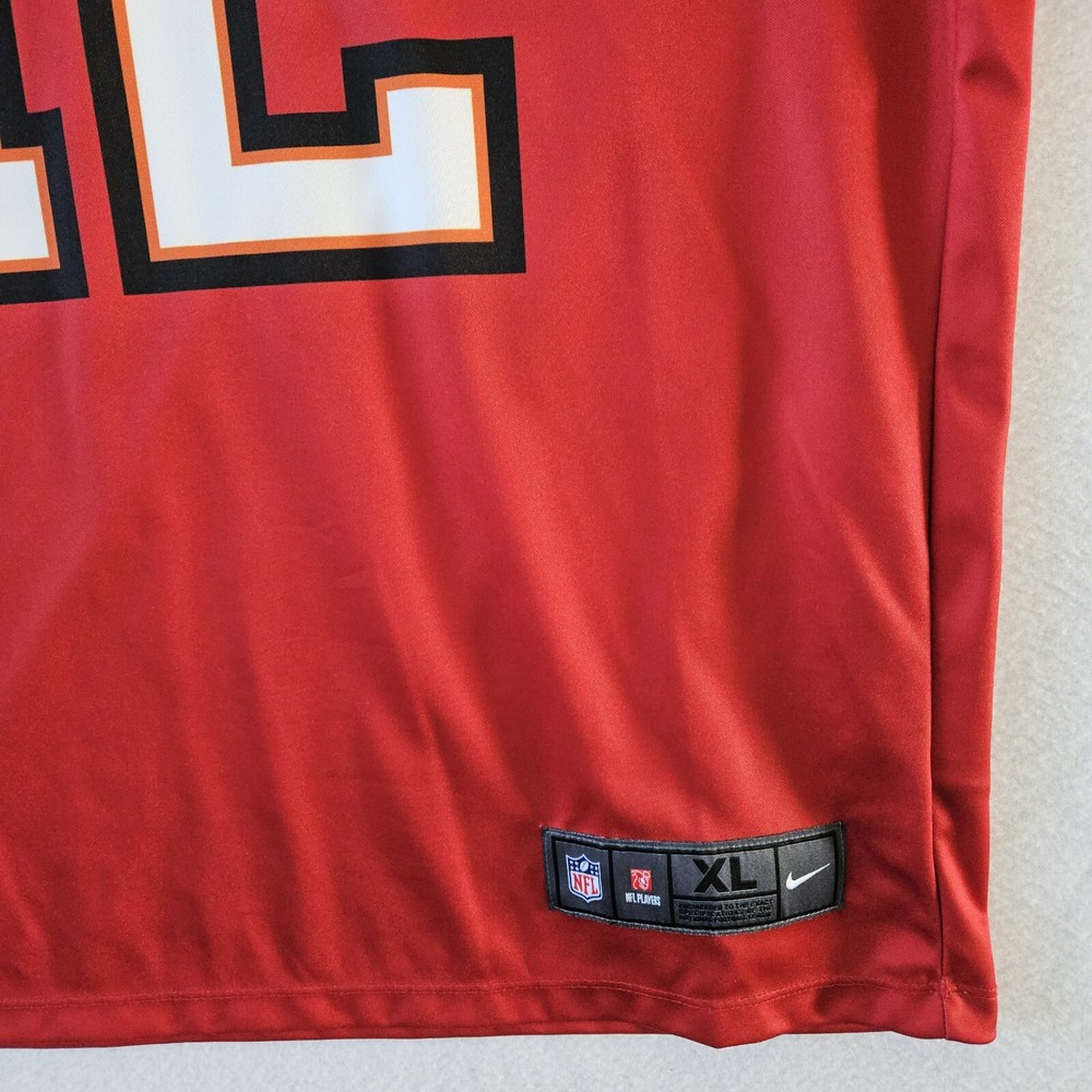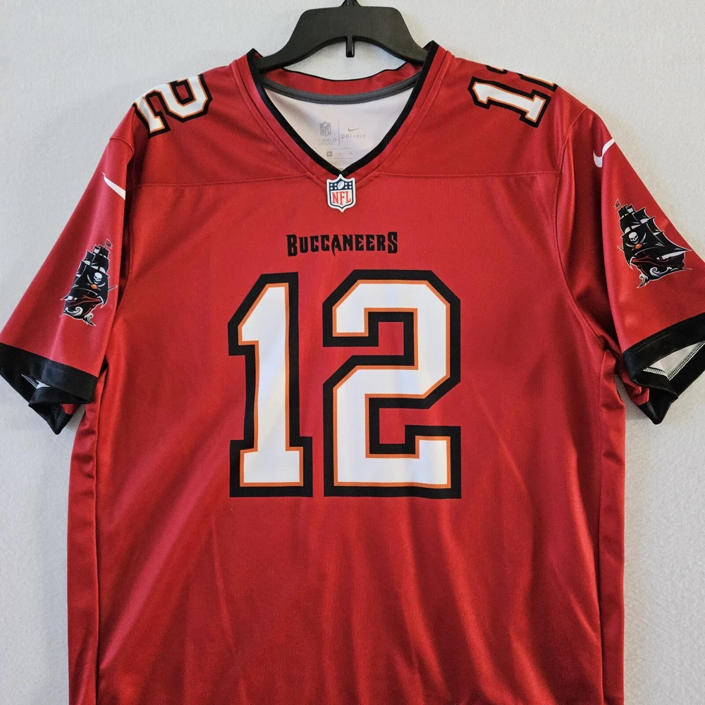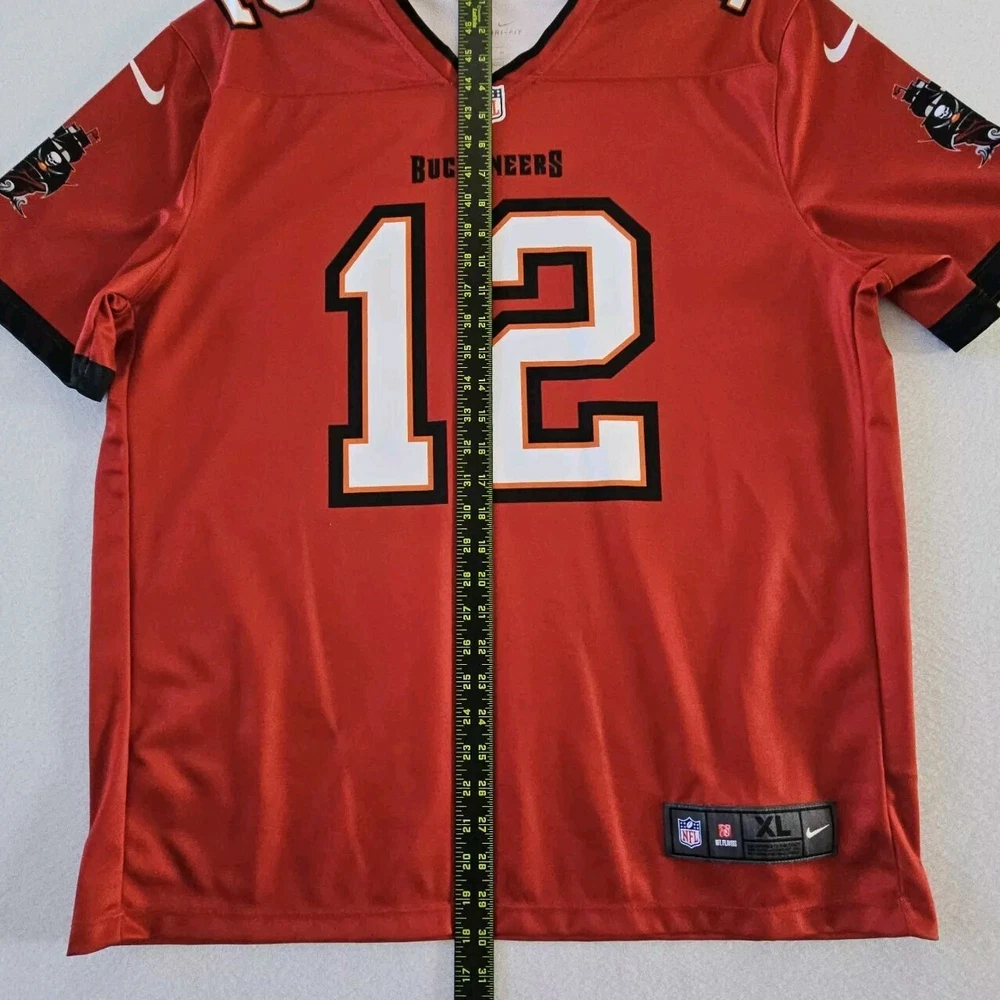 100% polyester short sleeve jersey onfield apparel nike dri fit buccaneers #12 tom brady. Short sleeve shirt is in excellent clean condition no holes or tears. Sz XL Measures flat 21" across shoulders 24" pit to pit 30" Length