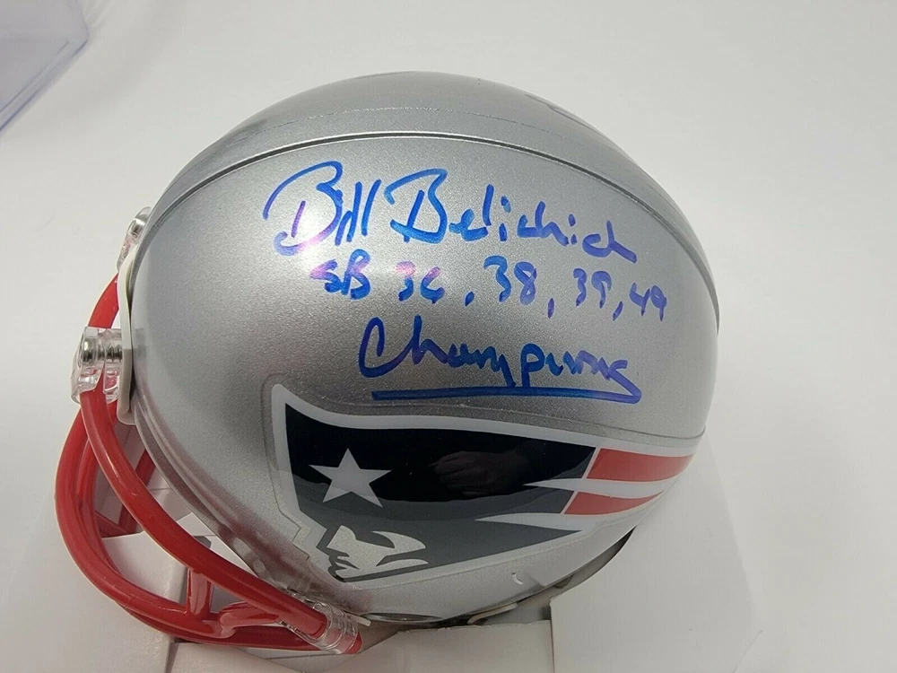 Tom Brady & Bill Belichick Dual "GOAT" Signatures w/Super Bowl Inscription Fantastic dual auto of future HOFers Tom Brady & Bill Belichick in clear, dark blue sharpie with inscription "SB 36, 38, 39 49 CHAMPIONS" under Belichick's auto. Both autographs are certified by Authentication Direct, an industry leader in sports, music, historical and political signatures with affixed hologram and certification #2335838. Please see their website at Authentication Direct (directcoa.com) to verify the authenticity. Rare helmet with dual autos of both legendary Patriots. USPS Priority Shipping with full insurance included. On-line payments only please (no checks, money orders, etc.). *********************************************** Thanks for stopping by and please check out our other auctions! We offer an eclectic mix of sports cards & memorabilia; quality fishing tackle to include discount, brand new Megabass lures; top-quality harmonicas and various other items. We ship the same day as your purchase whenever possible. *** Count On Super Fast & Safe Shipping - USA & APOs Only ***