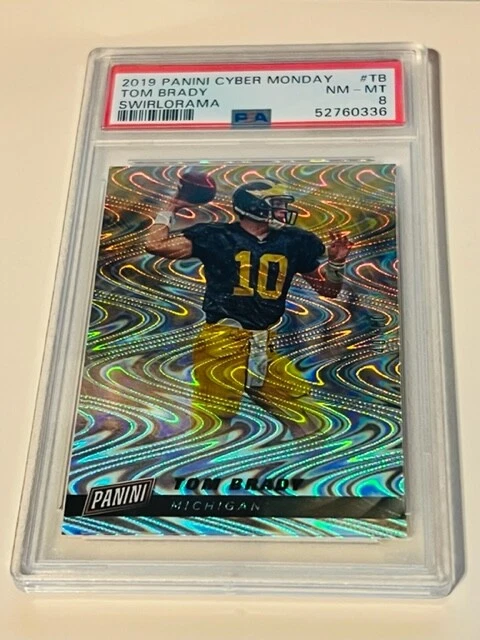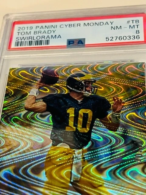 Absolutely awesome and highly collectible RARE 2019 Panini Cyber Monday SWIRLORAMA short print insert Tom Brady Graded a PSA 8 Population 1 with only 1 higher and serial numbered 40/50. See all pictures for amazing condition, size, and detail. There are absolutely no returns on sports cards as the market for sports cards changes literally on a daily basis. Check out my store for some of the rarest vintage collectibles online from all eras. Thanks for looking and have a great day!