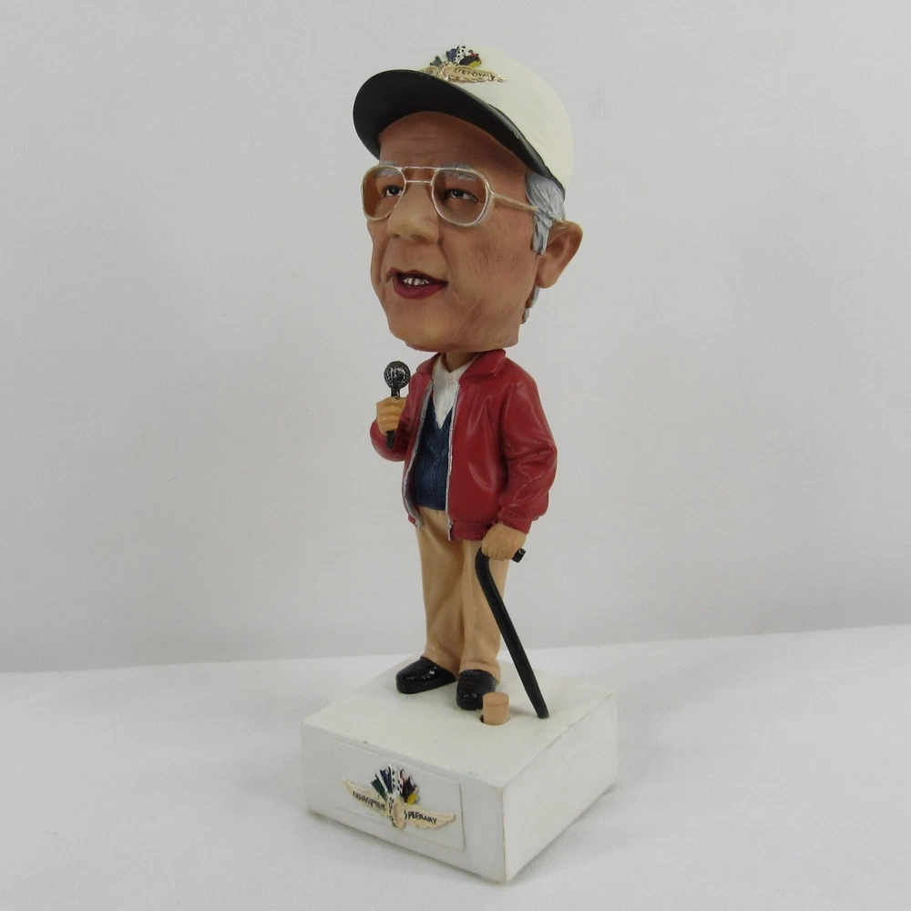 Tom Carnegie Talking Bobblehead Batteries Not Included 3 Batteries LR - 44 Button Cell Batteries Carnegie is best known for his deep and resonant voice as the public-address announcer from 1946 to 2006 for the Indianapolis Motor Speedway Three of Tom Carnegie Famous Phrases 1- It's a new track record 2- He's on it 3- Oh no he's slowing down on the backstretch Size: 2.64" W x 2.5" D x 8.25" T Condition: New Available For Immediate Shipping or Pick Up @ Race Day Memories Warehouse In Franklin, IN 46131 1 Business Day Handling Orders Processed Monday Through Friday Orders Paid By 11:59 am Eastern Standard Time - Ship Same Day Monday through Friday Combine Shipping on multiple items Place all the items in your shopping cart, then make request total; I will send a combined invoice as soon as possible; Shipping costs are calculated based on Weight, Size, and Destination. In some cases it may require packing the items before sending the invoice. Warehouse Location & Hours Race Day Memories Warehouse I n Franklin, IN 46131; Visiting or Pick Up Is By Appointment Only; Monday through Friday 12:00 p.m. until 4:00 p.m. Thanks for Visiting & Have A Great Race Day!!