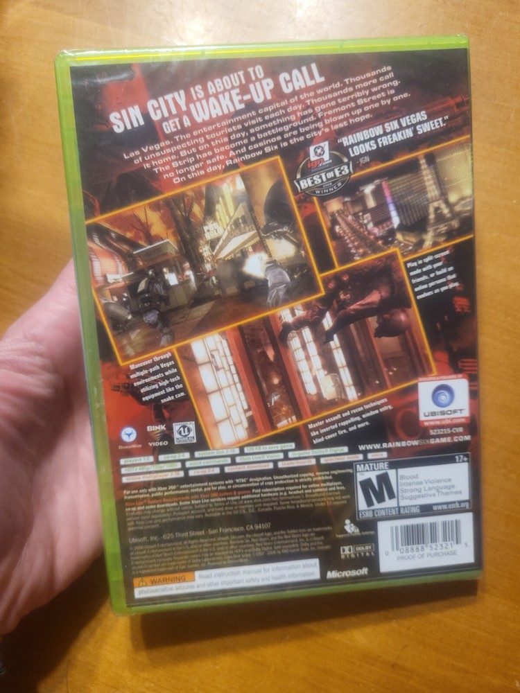 Game Name: Tom Clancy's Rainbow Six: Vegas Item Length: 7.50 in Item Width: 5.30 in brand: Ubisoft gtin13: 0008888523215 Item Weight: 0.25 lb Release Year: 2006 Publisher: Ubisoft Item Height: 0.60 in Number of Discs: 1 Rating: M Platform: Microsoft Xbox 360 UPC: 0008888523215
