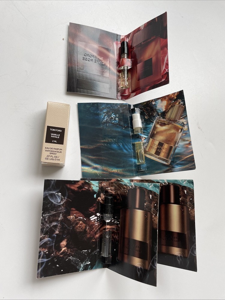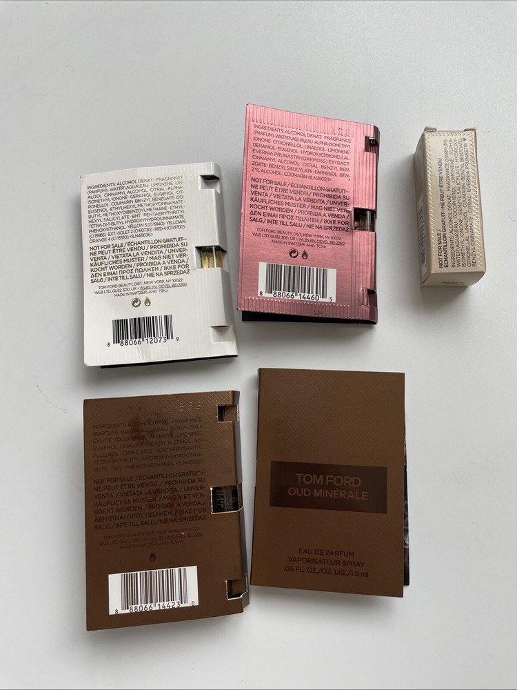 Set of 5 Tom Ford fragrance samples , each 1.5ml spray in original carded packaging. Includes a mixed variety of Tom Ford parfum scents (may include men’s, women’s, and unisex selections depending on batch). Oud mineral 2 Costa azzura 1 Vanilla fatale 1 Cafe rose 1