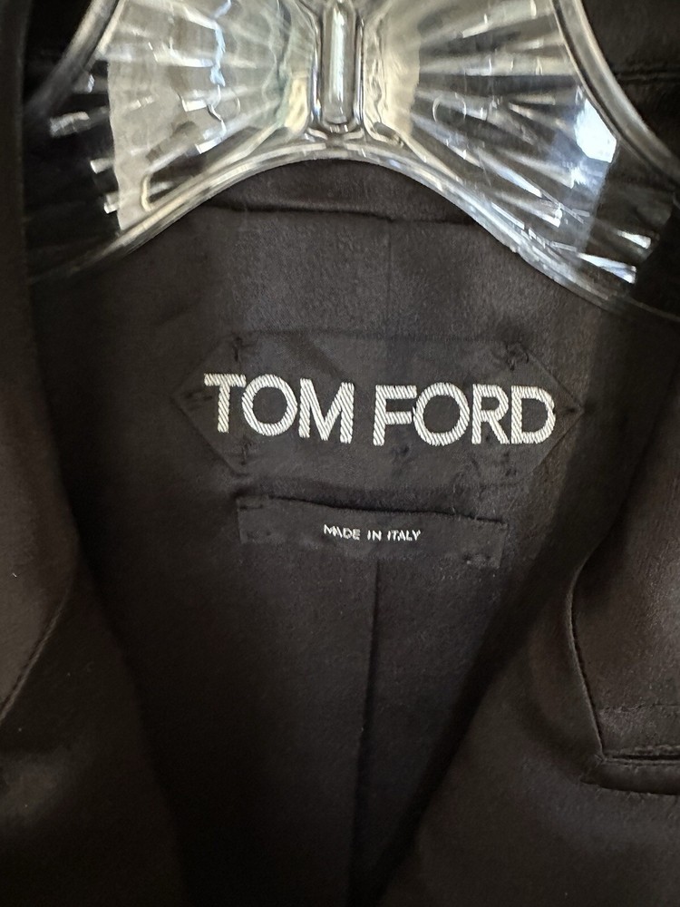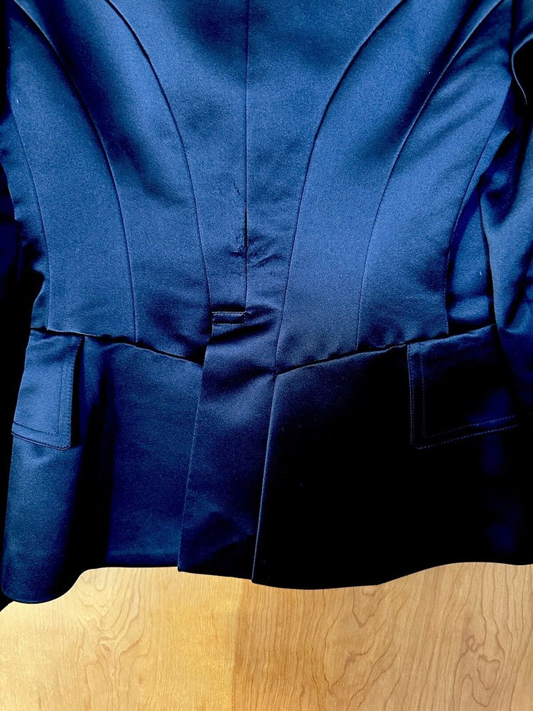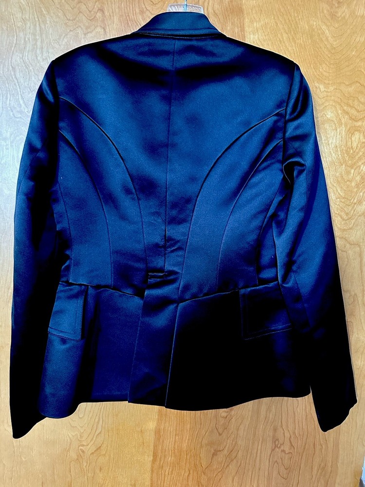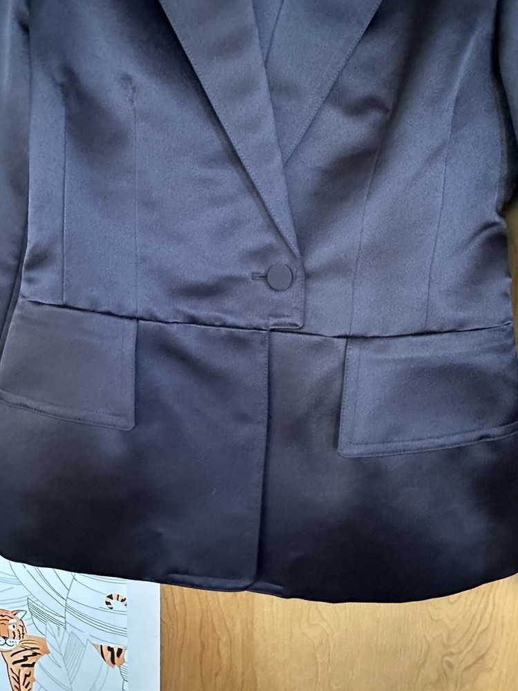 Condition like new Heavy silk outer, lining 100% silk One button closure, flap pockets Length about 24.5 inches Armpit to armpit about 18 inches Fitted style