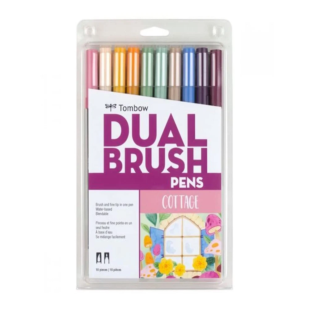 Set of 10 Dual Brush Pen colors. Flexible brush tip and fine tip in one marker. Brush tip works like a paintbrush to create fine, medium or bold strokes; fine tip gives consistent lines. Dual Brush Pens are ideal for artists and crafters. The water-based ink is blendable and the resilient nylon brush retains its point stroke after stroke. Colors Included: 772 Dusty Rose, 910 Opal, 993 Chrome Orange, 946 Gold Ochre, 192 Asparagus, 312 Holly Green, 992 Sand, 526 True Blue, 679 Dark Plum, 757 Port Red. Water-based pens ideal for coloring, fine art, illustrations, doodling, journaling, hand lettering and more. Set of 10 Tombow Dual Brush Pens. Flexible brush tip and fine tip in one marker. Brush tip works like a paintbrush to create fine, medium or bold strokes fine tip gives consistent lines Tips self-clean after blending. Acid-Free, Odorless.