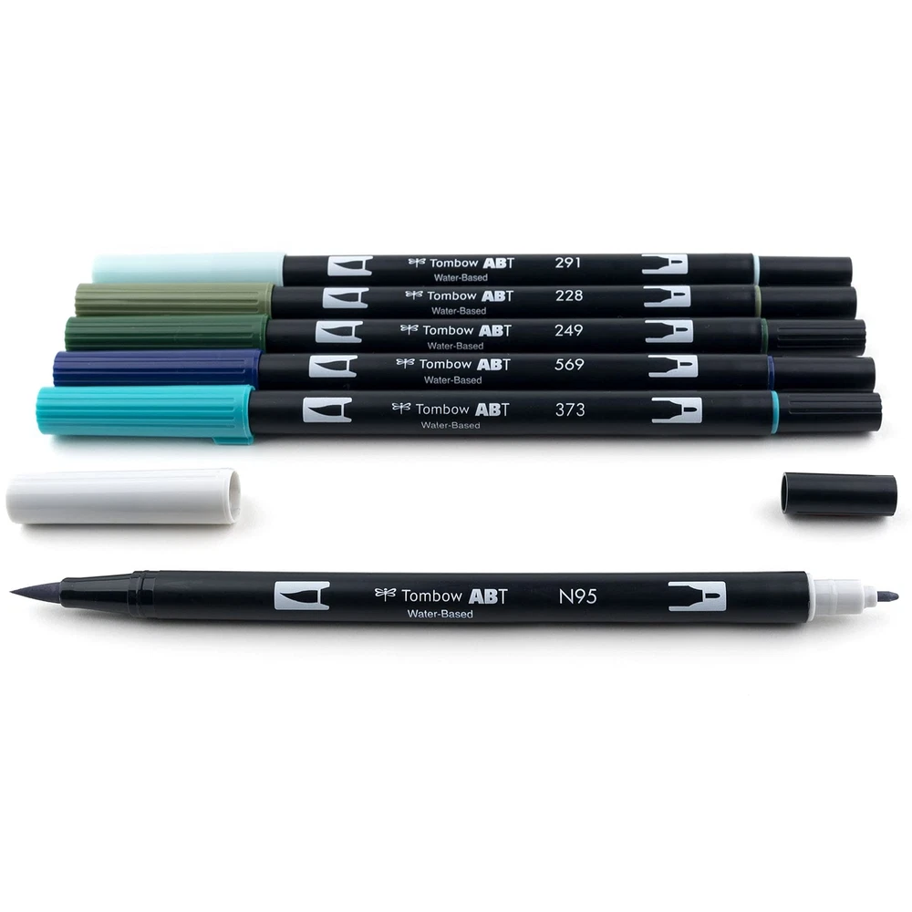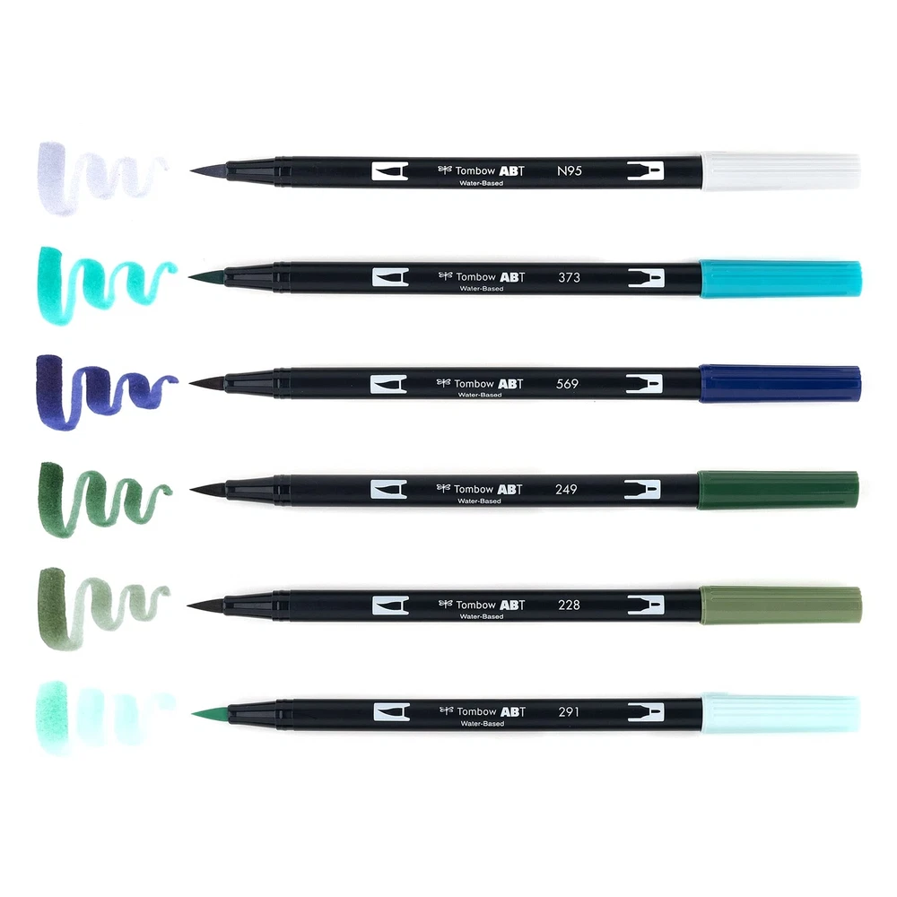 Set of 6 colors. Dual Brush Pens feature flexible brush tip and fine tip in one marker. Brush tip works like a paintbrush to create fine, medium or bold strokes; fine tip gives consistent lines. Dual Brush Pens are ideal for artists and crafters. The water-based ink is blendable and the resilient nylon brush retains its point stroke after stroke. Wonderland color palette specially curated to complement art and craft projects for wintertime. Colors include: 291 Alice Blue, 228 Gray Green, 249 Hunter Green, 569 Jet Blue, 373 Sea Blue, N95 Cool Gray 1. Ideal for hand lettering, watercolor, fine art, illustrations, doodling, journaling, coloring and more Water-based Blendable Acid-free, odorless Tips self-clean after blending