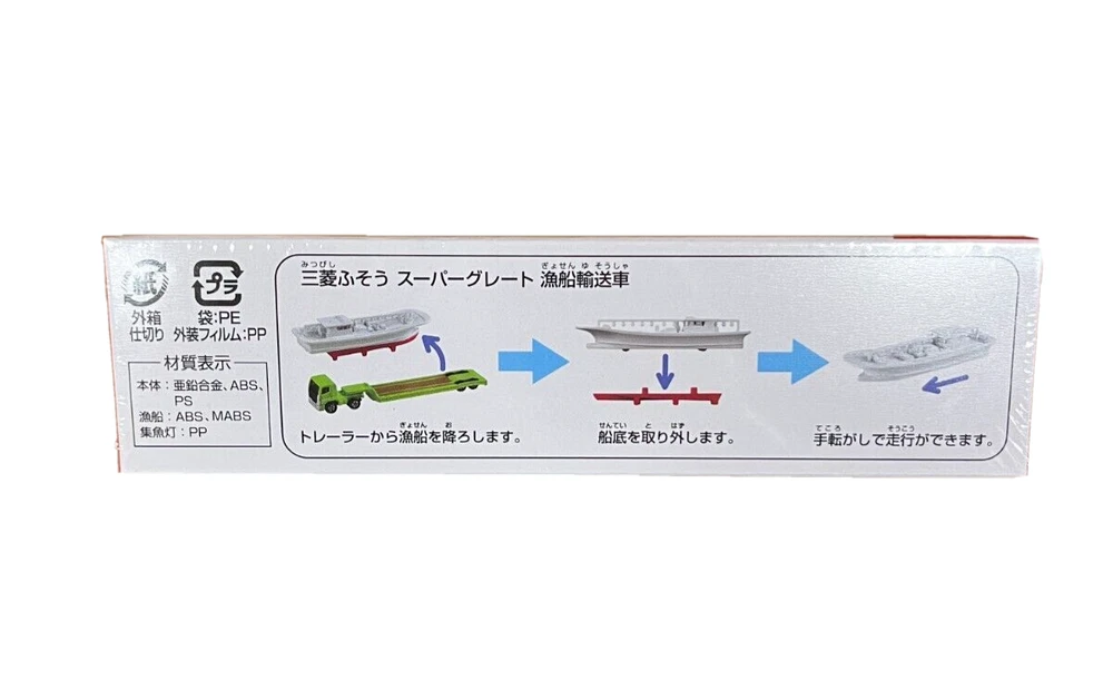 Takara Tomy Long Type Series NO.150 Mitsubishi Fuso Super Great Fishing Boat Transporter Product Information: Name NO.150-05 Mitsubishi Fuso Super Great Fishing Boat Transporter Scale N/A Color N/A Released March 18, 2023 Material Alloy, Plastic Feature Metal Structure Origin Vietnam Remark Not suitable for children under 3 years old Function table: Functional parts Movable Doors ✘ Headlamps ✘ Boat(remove) ✓ Suspension ✘ Others N/A Notes: Its front and back portions can be separated, and its back can rotate left to right. There are not listed the all items, if you need other models, please contact me or leave a message. Shipping time: For US SpeedPAK Standard shipping is about 8 ~ 12 working days with full tracking. For international standard shipping is about 10 ~ 19 working days with full tracking.
