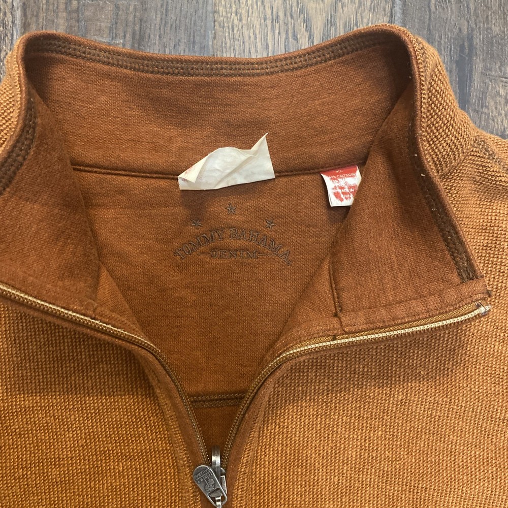 Personalization Instructions: na Department: Men Accents: Embroidered, Logo Type: Sweater California Prop 65 Warning: na Size Type: Regular Fit: Regular Knit Style: Tight-Knit Color: Orange Neckline: Mock Neck Country of Origin: China Material: Cotton Blend Garment Care: Machine Washable Features: 1/4 Zip, All Seasons Performance/Activity: Golf, Hiking, Walking Vintage: Yes Fabric Type: Knit Personalize: No Size: XL Pattern: Solid Occasion: Business, Casual, Party/Cocktail, Travel Sleeve Length: Long Sleeve Character: Stitch Style: Pullover Season: Fall, Spring, Summer, Winter Brand: Tommy Bahama Theme: Classic, Outdoor, Preppy