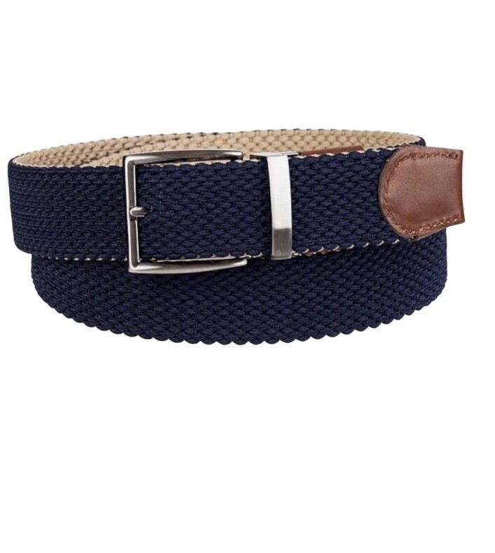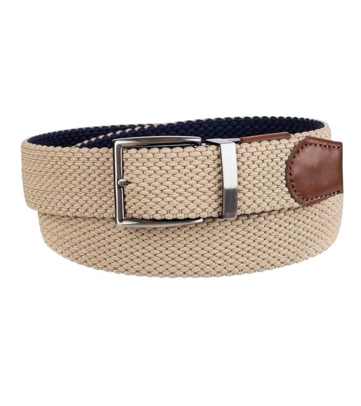 The Tommy Bahama Braided Stretch Belt in Khaki/Navy is a versatile accessory for men, featuring a reversible design that allows for easy styling in either khaki or navy. Made from spandex, this belt offers a comfortable fit and a solid pattern with subtle logo accents. It can be worn as a casual golf belt or a more dressed-up classic belt, making it a stylish choice for various occasions. Perfect for adding a touch of designer flair to any outfit, this Tommy Bahama belt is a must-have for those looking for a unique and high-quality accessory.