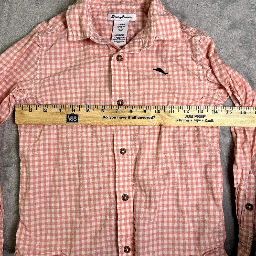 Garment Care: Machine Washable Color: Pink Brand: Tommy Bahama Material: 100% Cotton Fit: Regular Department: Boys Features: Logo Vintage: No Collar Style: Spread Season: Fall, Spring, Winter Sleeve Length: Long Sleeve Neckline: Collared Closure: Button Handmade: No Occasion: Formal, Party, Wedding Pattern: Plaid Theme: Classic, Preppy, School Type: Button-Up Country of Origin: India Fabric Type: Woven Chest Size: 28 in Size: M