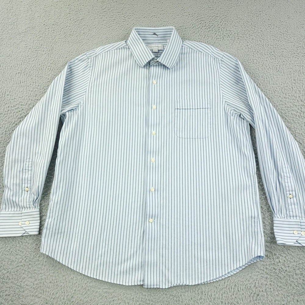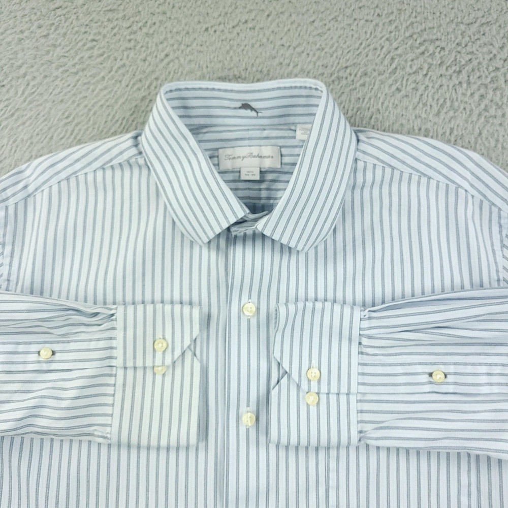 Tommy Bahama Dress Shirt Mens 16.5 Blue Stripe 100% Cotton Long Sleeve Brand: Tommy Bahama. Style: Mens long sleeve dress shirt with full button front placket and spread collar. Color: Light blue base with darker blue vertical stripes. Size on tag: Mens 16.5 Material: 100% cotton woven twill fabric with subtle herringbone texture. Made in China. Features: Classic business-ready silhouette designed for all-season wear, front button closure with pearlized buttons, single chest patch pocket on left side, long sleeves with barrel cuffs and adjustable button closures, back yoke with pleats for comfortable movement, curved shirttail hem suitable for tucking, subtle marlin logo printed at interior back neck above the woven Tommy Bahama label, interior size tag reading 16½ 34–35, interior fabric tag indicating 100% cotton with RN 86549 and CA 55397. Measurements are included in the photos, compare measurements with your item to ensure proper fit. Items are added daily click here to Visit My Store Combined shipping for US customers is 1.99 for each additional item Items are cleaned per eBay standards & policies