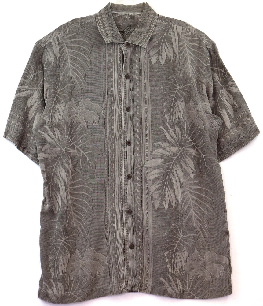 Tommy Bahama Hawaiian Camp Shirt Mens Large 100 Silk 3D Knit Palm Leaves Gray