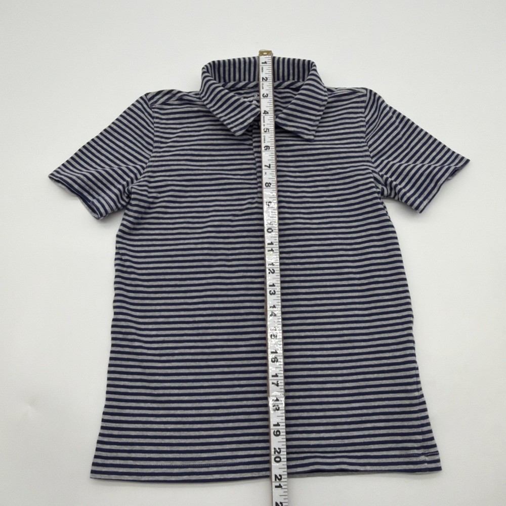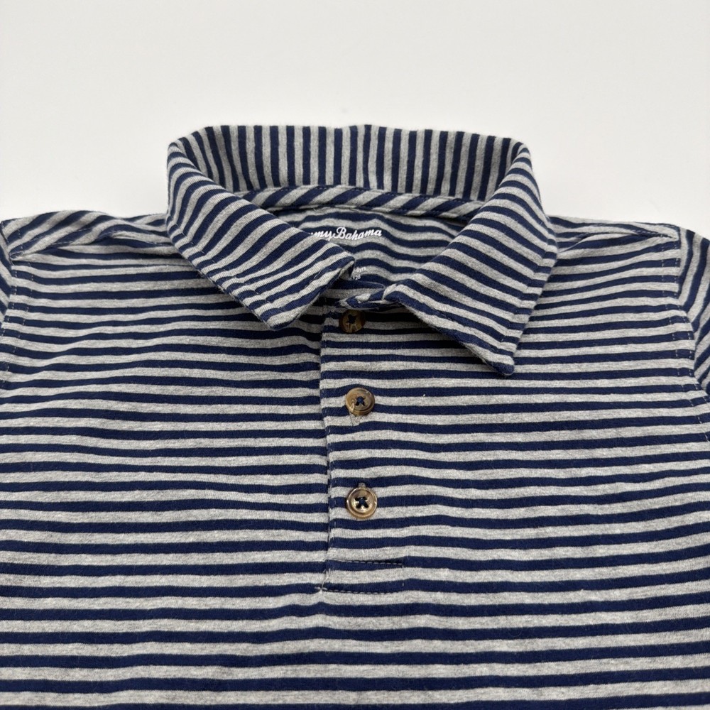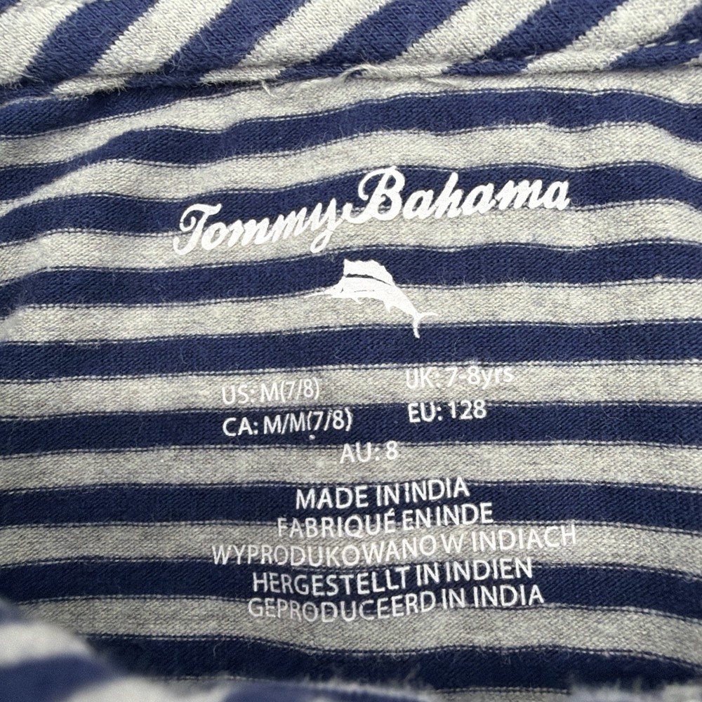 The Tommy Bahama Polo Shirt for Youth Boys in size M (7/8Y) features a classic collared design with a button closure, making it perfect for casual occasions, travel, or parties. The shirt's blue and gray stripes add a fun and vibrant touch, while the blend of polyester, spandex, and cotton ensures comfort and flexibility. Ideal for fall and spring seasons, this pullover style shirt is great for activities such as walking, school, or beach outings. With a beach-themed accent and a classic fit, this Tommy Bahama polo shirt is a stylish choice for young boys. Check pictures for flaws and measurements