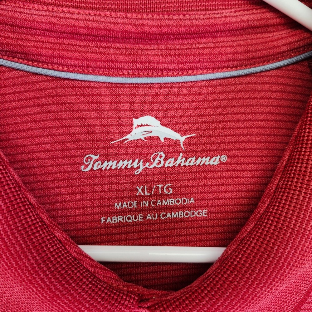 A classic polo shirt, perfect for casual wear. This short-sleeved polo features a three-button placket and a subtle striped pattern throughout. The shirt has a traditional collar and a straight hem. There is a small, faint spot on the front of the shirt. Color: Red Department: Men Type: Polo Performance/Activity: Golf, Walking, Beach, Tennis Sleeve Length: Short Sleeve Fabric Wash: Light Character: Fisherman, Happy, Ken, Captain America, Godzilla Pattern: Striped Fit: Regular Material: Cotton Blend, Polyester Blend, 100% Cotton, 100% Polyester Keywords: Tommy Bahama, polo shirt, men's polo, short sleeve, casual shirt, red polo, striped polo, XL, extra large, men's clothing, polo top, button down, collared shirt, preowned all items have been cleaned and disinfected we stand behind all items we sell so please contact us if you have an issue with any order