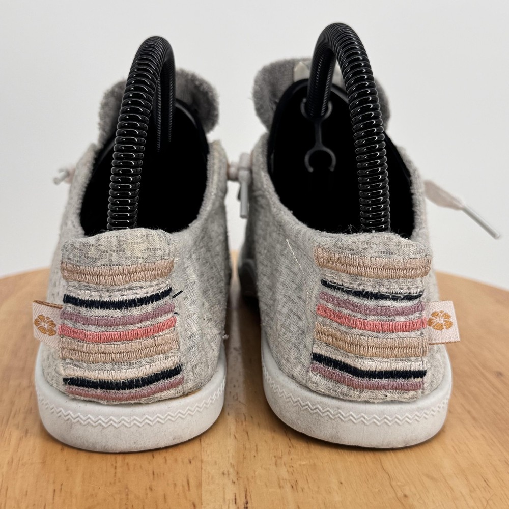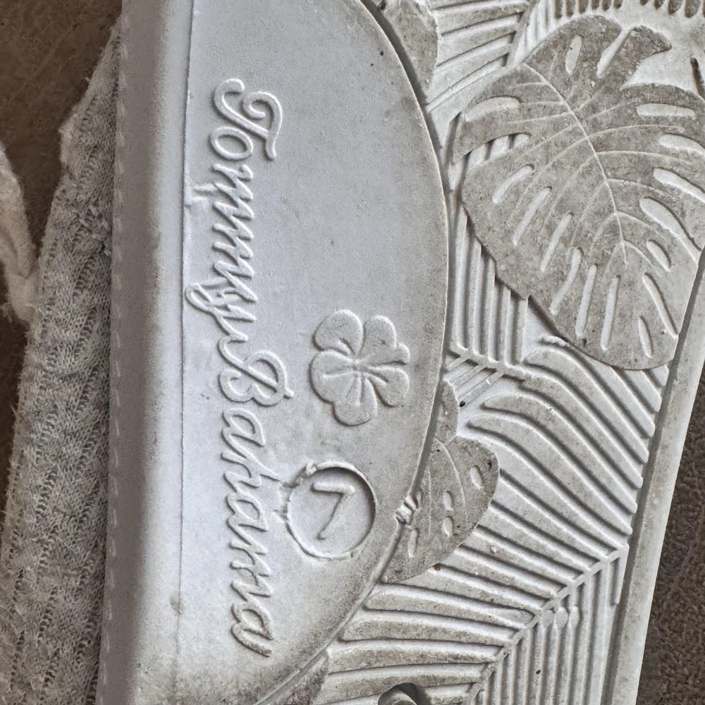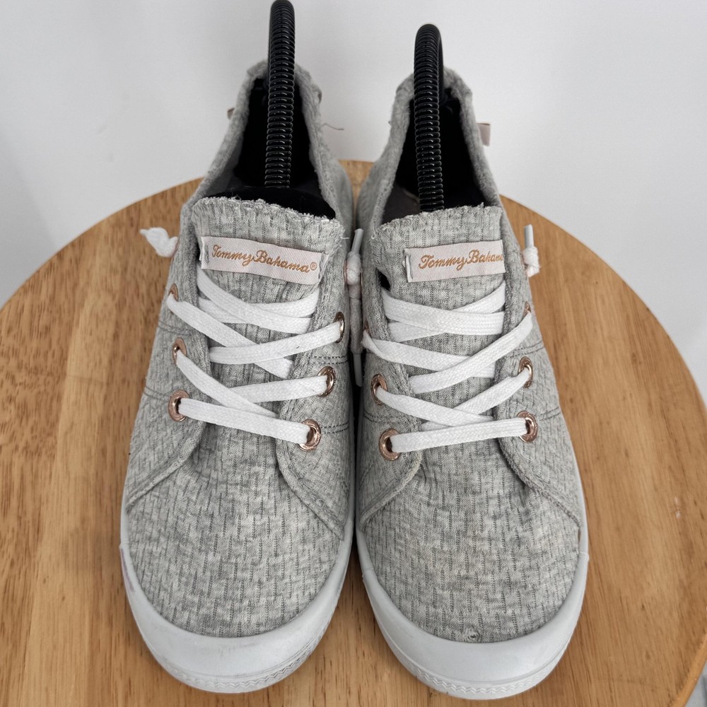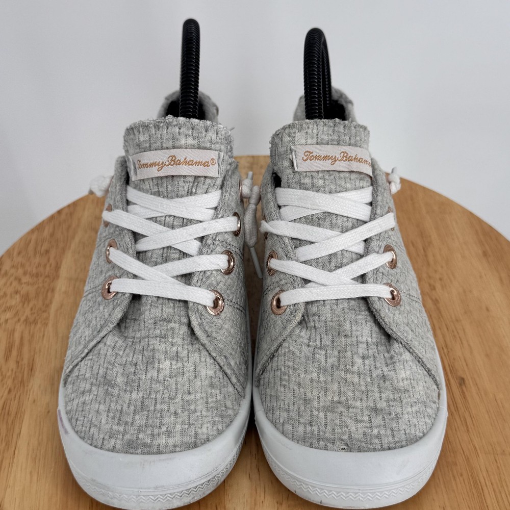 Tommy Bahama Shoes Womens Size 7 Gray Textile Lace Up Casual Sneakers 70 112397 Previously worn sneakers with a small worn-through hole at the toe of one shoe as shown. Uppers otherwise clean with light fabric fuzz; midsoles and outsoles show light dirt and wear from use. Insoles, laces, and eyelets remain intact and secure; no original box or tags included. Brand: Tommy Bahama Style: Low-top lace-up casual sneakers with woven-look textile upper. Size: Womens US 7 (per inner size tag and molded outsole marking). Color: Light heather gray upper with white midsoles, white laces, and multicolor striped heel detail in pink, tan, and navy. Materials: Textile upper; rubber outsole with textile insert as stated on interior label; textile lining and cushioned insole. Features: Low-profile silhouette, lace-up closure with white laces and rose gold-tone eyelets, lightly padded collar, heel pull tab with embroidered stripes, flexible rubber outsole with tropical leaf tread pattern and Tommy Bahama branding, standard width fit. Style/Model codes: 70 112397, 152597, S972 (printed on interior label). Made in China. Ideal for casual wear, travel, and everyday walking comfort. 112517