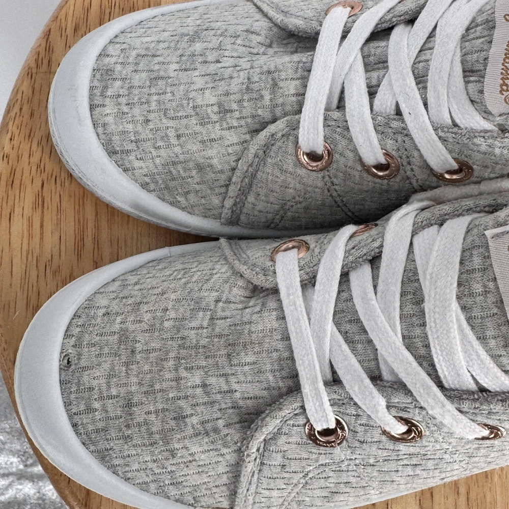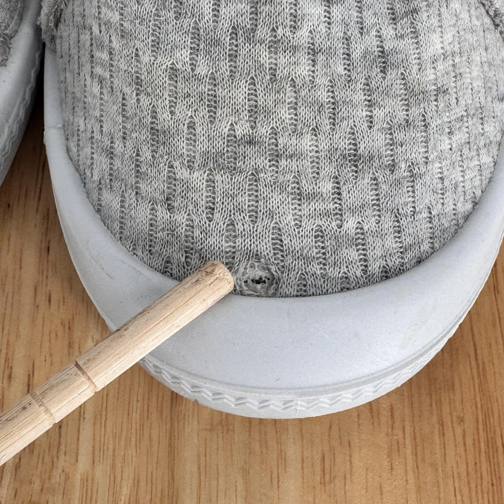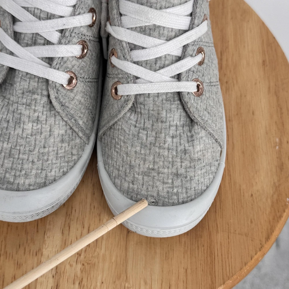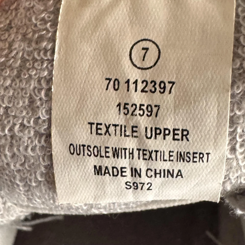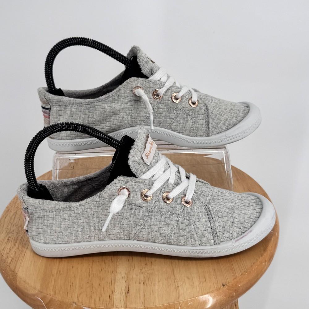 Tommy Bahama Shoes Womens Size 7 Gray Textile Lace Up Casual Sneakers 70 112397 Previously worn sneakers with a small worn-through hole at the toe of one shoe as shown. Uppers otherwise clean with light fabric fuzz; midsoles and outsoles show light dirt and wear from use. Insoles, laces, and eyelets remain intact and secure; no original box or tags included. Brand: Tommy Bahama Style: Low-top lace-up casual sneakers with woven-look textile upper. Size: Womens US 7 (per inner size tag and molded outsole marking). Color: Light heather gray upper with white midsoles, white laces, and multicolor striped heel detail in pink, tan, and navy. Materials: Textile upper; rubber outsole with textile insert as stated on interior label; textile lining and cushioned insole. Features: Low-profile silhouette, lace-up closure with white laces and rose gold-tone eyelets, lightly padded collar, heel pull tab with embroidered stripes, flexible rubber outsole with tropical leaf tread pattern and Tommy Bahama branding, standard width fit. Style/Model codes: 70 112397, 152597, S972 (printed on interior label). Made in China. Ideal for casual wear, travel, and everyday walking comfort. 112517
