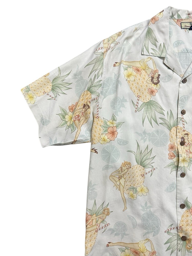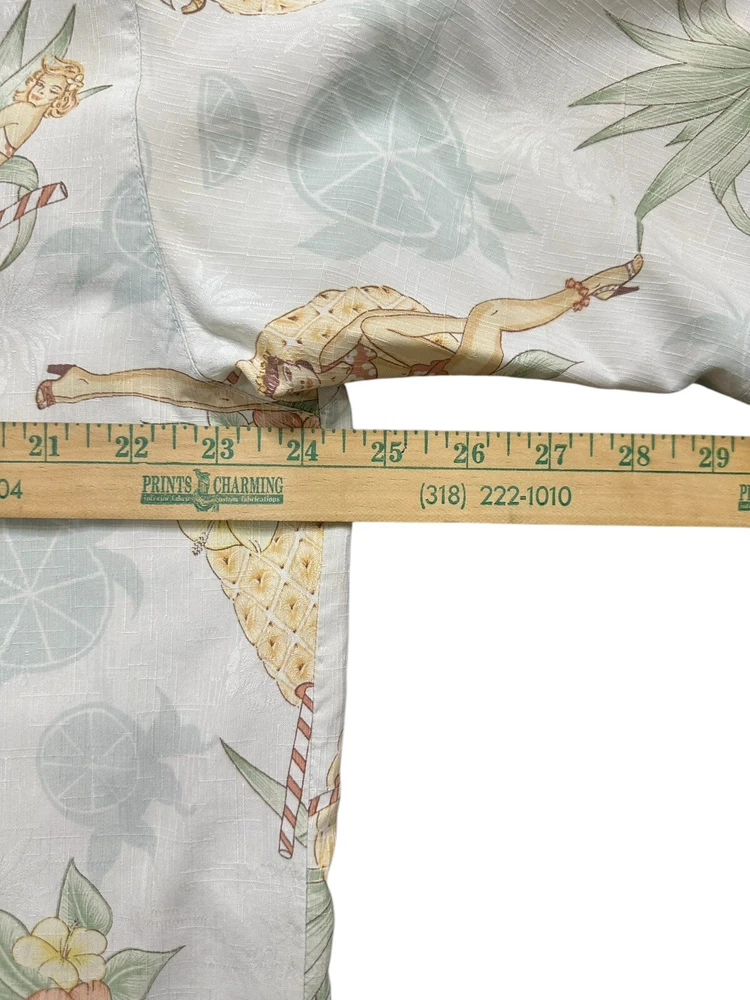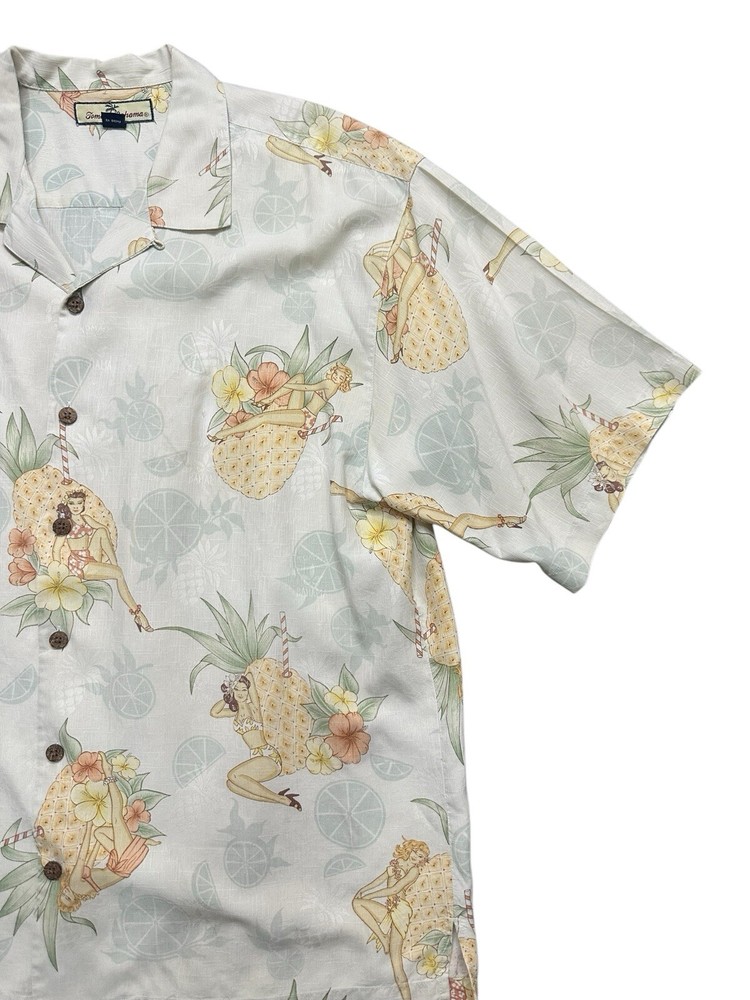 Please see pictures for an accurate description. Same day business shipping. Pet loving smoke-free shipping home. Thank you so much for your interest. If you have any questions, please feel free to ask. Get ready to embrace the tropical vibes with this Tommy Bahama Silk Pineapple Cocktail Hawaiian Bikini Girl Shirt. This shirt is perfect for those who love to add a touch of fun and color to their wardrobe. The shirt features a spread collared neckline, short sleeves, and a button closure. The shirt is made from lightweight and breathable silk knit fabric, which makes it suitable for all seasons. The shirt is adorned with a vibrant multicolor pineapple and pin-up girl pattern that adds a touch of playfulness to your outfit. This regular fit shirt is perfect for men who love to show off their style and personality.