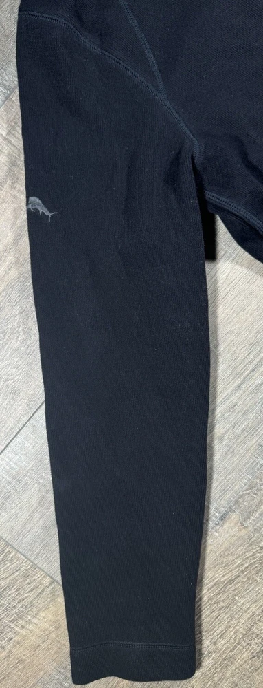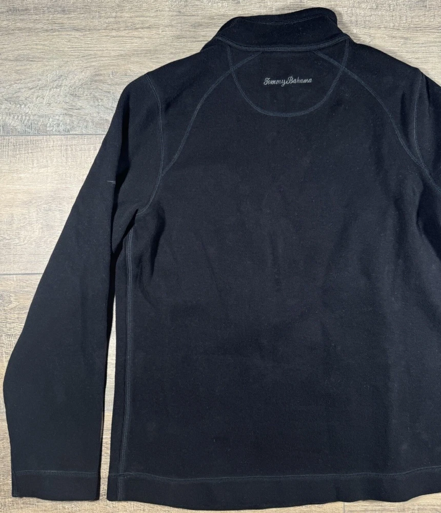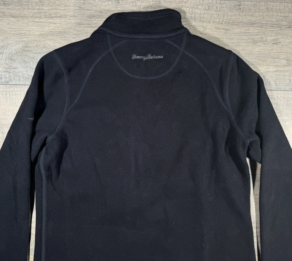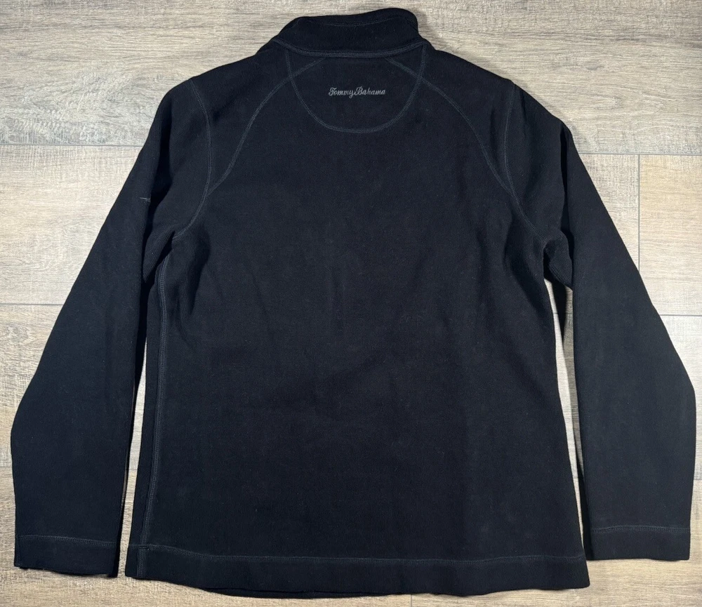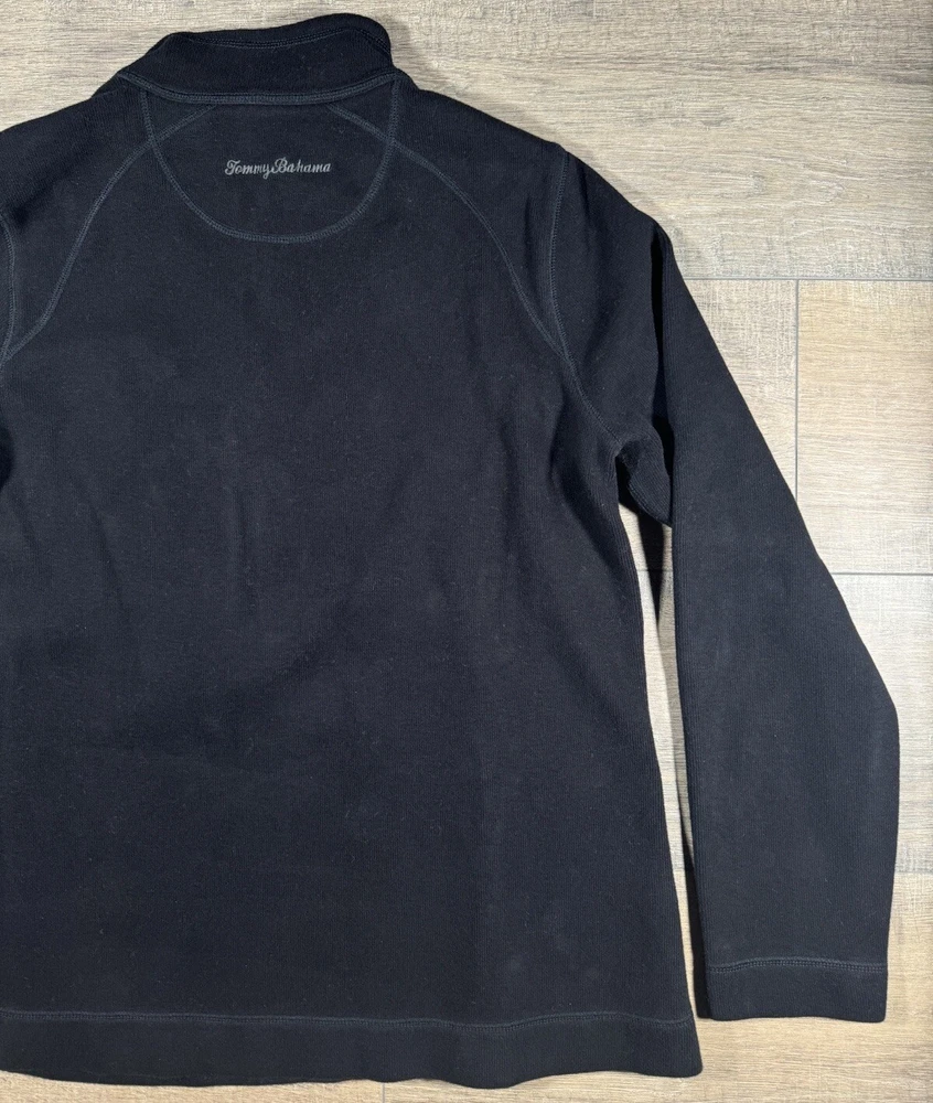 Type: Sweater Pattern: Solid Neckline: Mock Neck Size Type: Regular Material: Cotton Color: Black Features: 1/4 Zip Brand: Tommy Bahama Occasion: Casual, Party/Cocktail, Travel Size: L Fit: Regular Season: Fall, Spring, Winter Department: Women Vintage: No Fabric Type: Knit Style: Pullover Garment Care: Machine Washable Sleeve Length: Long Sleeve Theme: Outdoor Accents: Logo, Zipper