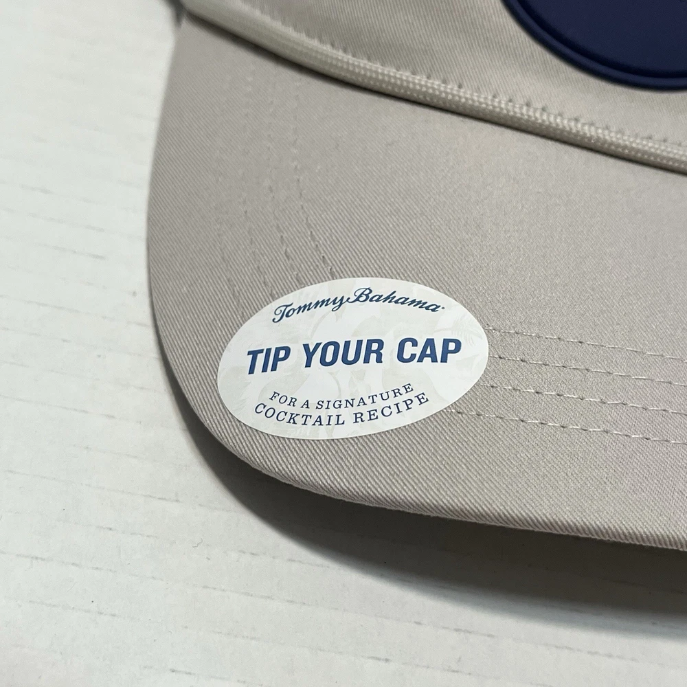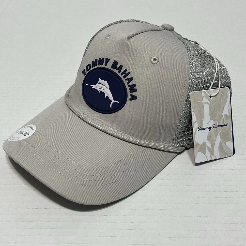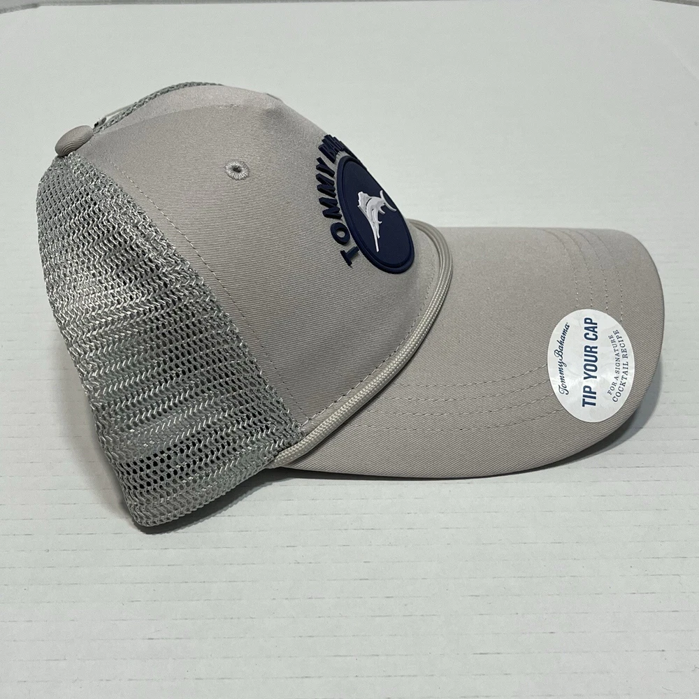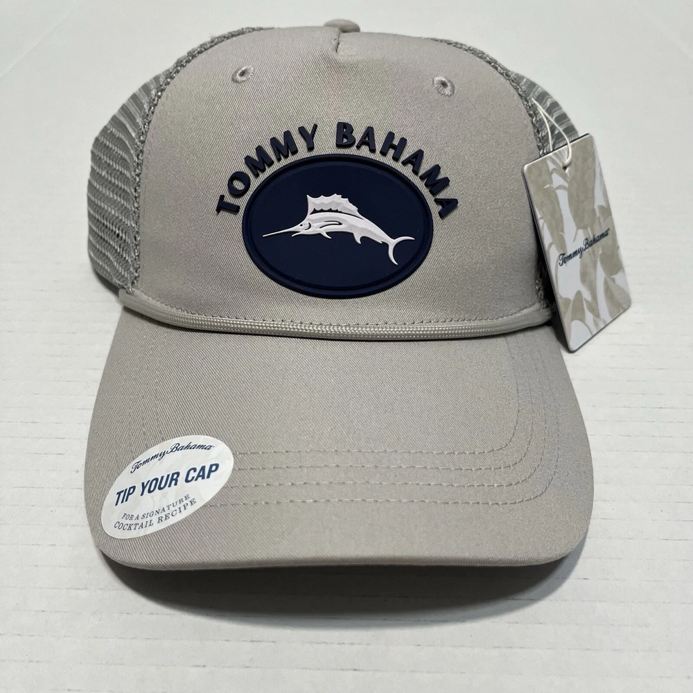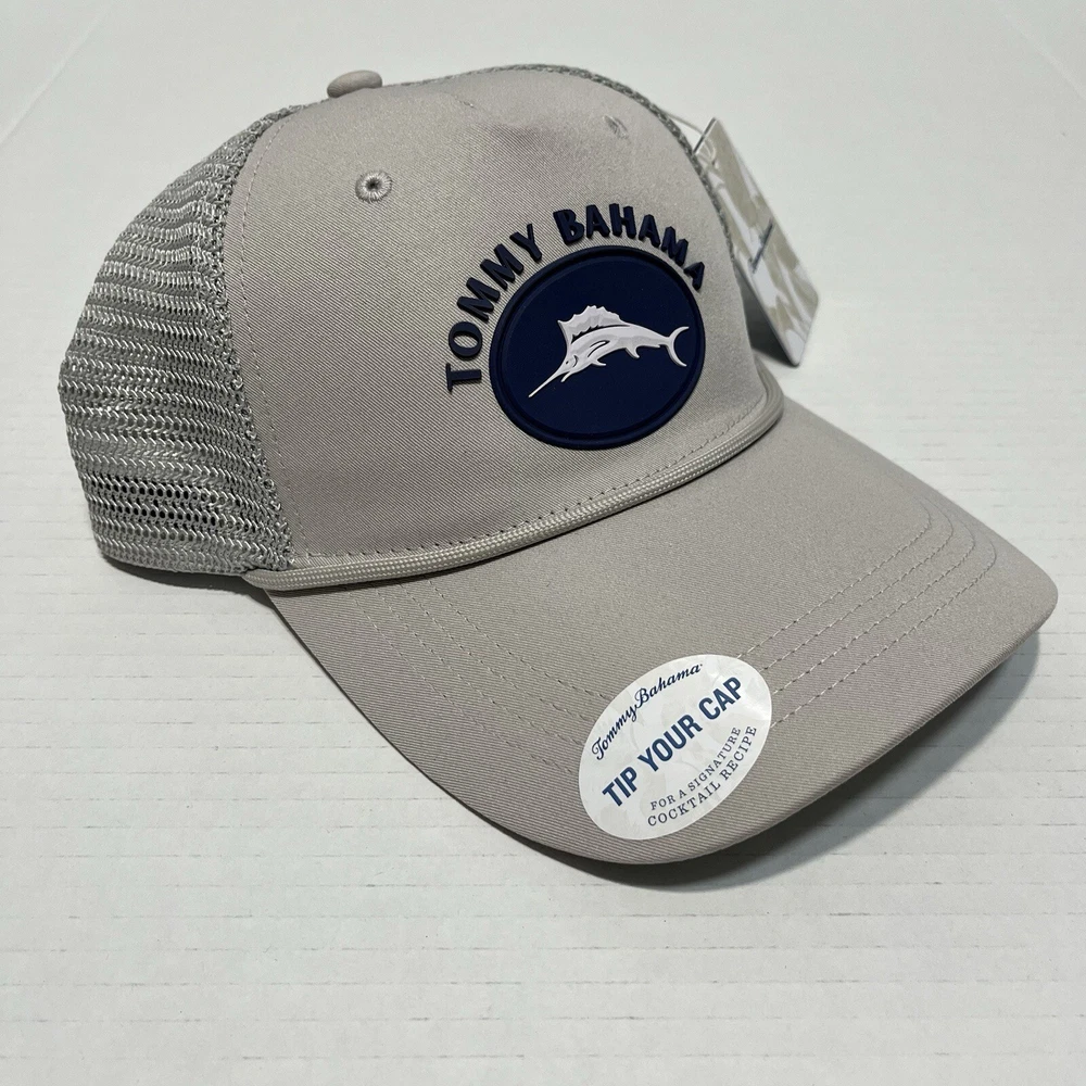 Tommy Bahama "Tip Your Cap" Marlin Rubber Patch Logo Mens Trucker Hat With Cord Tan & Navy Blue. Condition is New with tags. Shipped in a box with USPS Ground Advantage. Size: One Size Front Fabric type: 70% Cotton, 30% Polyester Back Fabric type: 100% Polyester Closure type: Pull-On with Adjustable Snapback Color: Gray & Navy Blue Care instructions: Hand Wash Only Tip the cap: For a Baja Margarita recipe