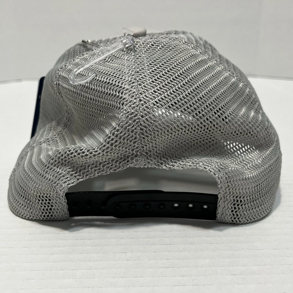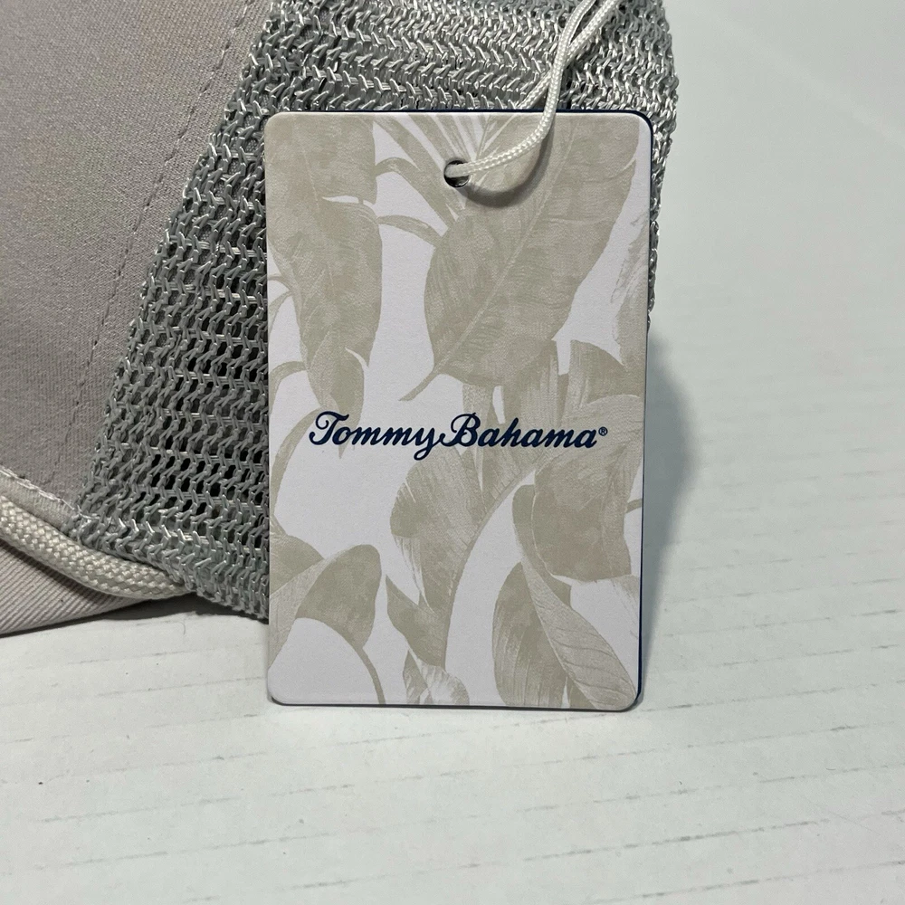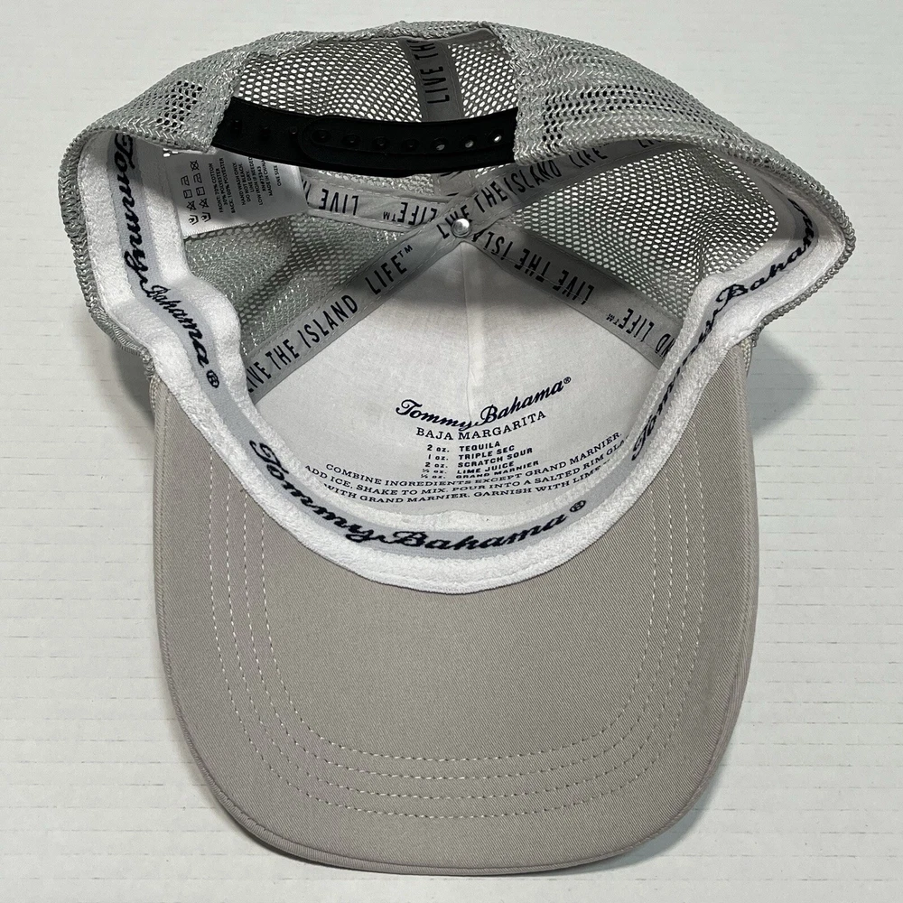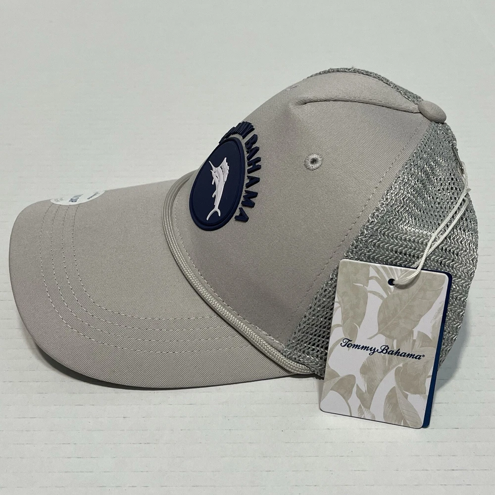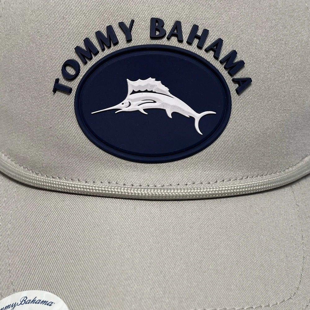 Tommy Bahama "Tip Your Cap" Marlin Rubber Patch Logo Mens Trucker Hat With Cord Tan & Navy Blue. Condition is New with tags. Shipped in a box with USPS Ground Advantage. Size: One Size Front Fabric type: 70% Cotton, 30% Polyester Back Fabric type: 100% Polyester Closure type: Pull-On with Adjustable Snapback Color: Gray & Navy Blue Care instructions: Hand Wash Only Tip the cap: For a Baja Margarita recipe