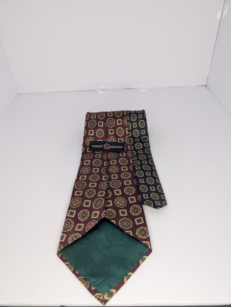 Tommy Hilfiger 100% Silk Tie Made in USA Maroon & Navy Geometric Print Mens
