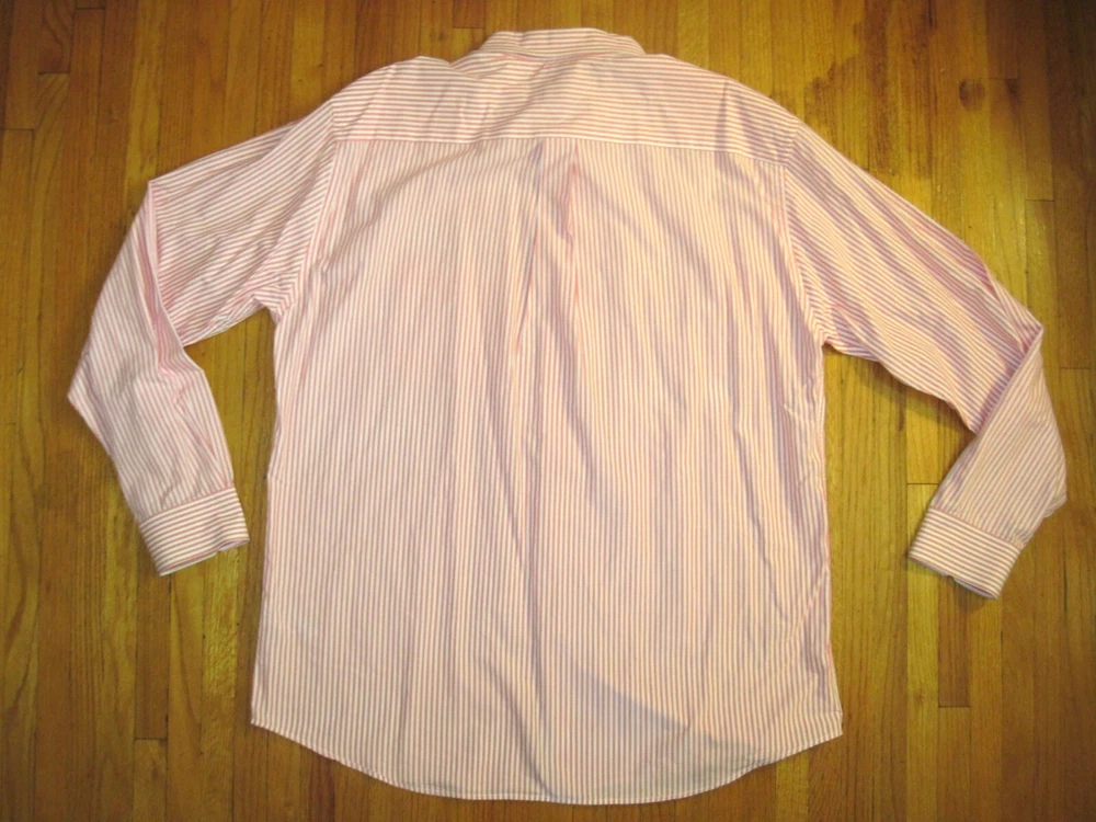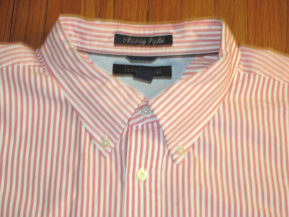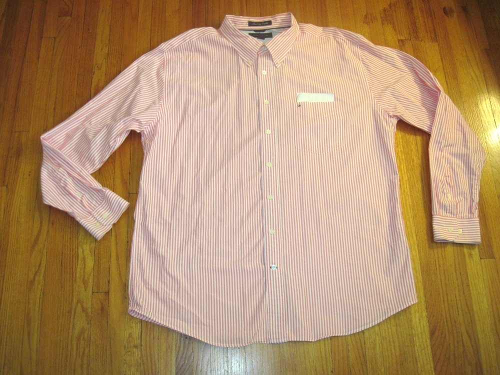 Tommy Hilfiger Academy Poplin Red/White Pinstripe Oxford Dress Shirt 2X New. Made of cool easy care 100% Cotton. Left chest pocket, 1 button cuff. Relaxed 54" chest, 34" overall length from base of collar to hem, 37" sleeve length from center collar to cuff. Comes from a pet free smoke free home.