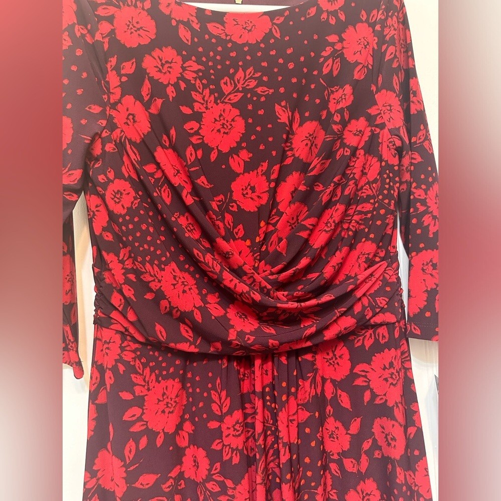 Tommy Hilfiger Black & Red Floral Fit & Flare Dress Round Neck Flowers NWT. Size 10. Jersey knit. 3/4 sleeve. Ruched waist.