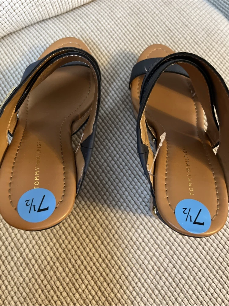 Outsole Material: Cork Vintage: No Color: Blue Type: Heel Pattern: Solid gtin13: 193391188805 Heel Style: Wedge Upper Material: Synthetic Brand: Tommy Hilfiger Closure: Slip On Toe Shape: Open Toe Character: Tommy Heel Height: High (3-3.9 in) US Shoe Size: 7.5 UPC: 193391188805 Style: Platform Insole Material: Cork Department: Women