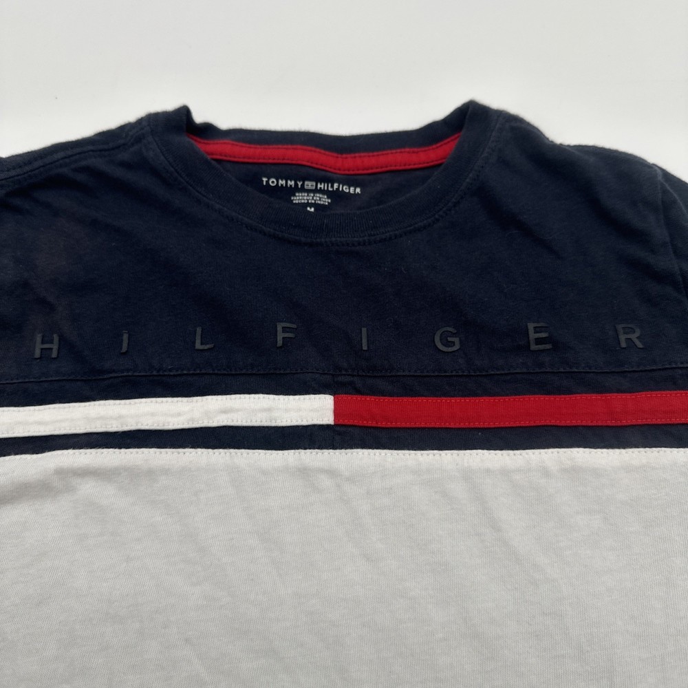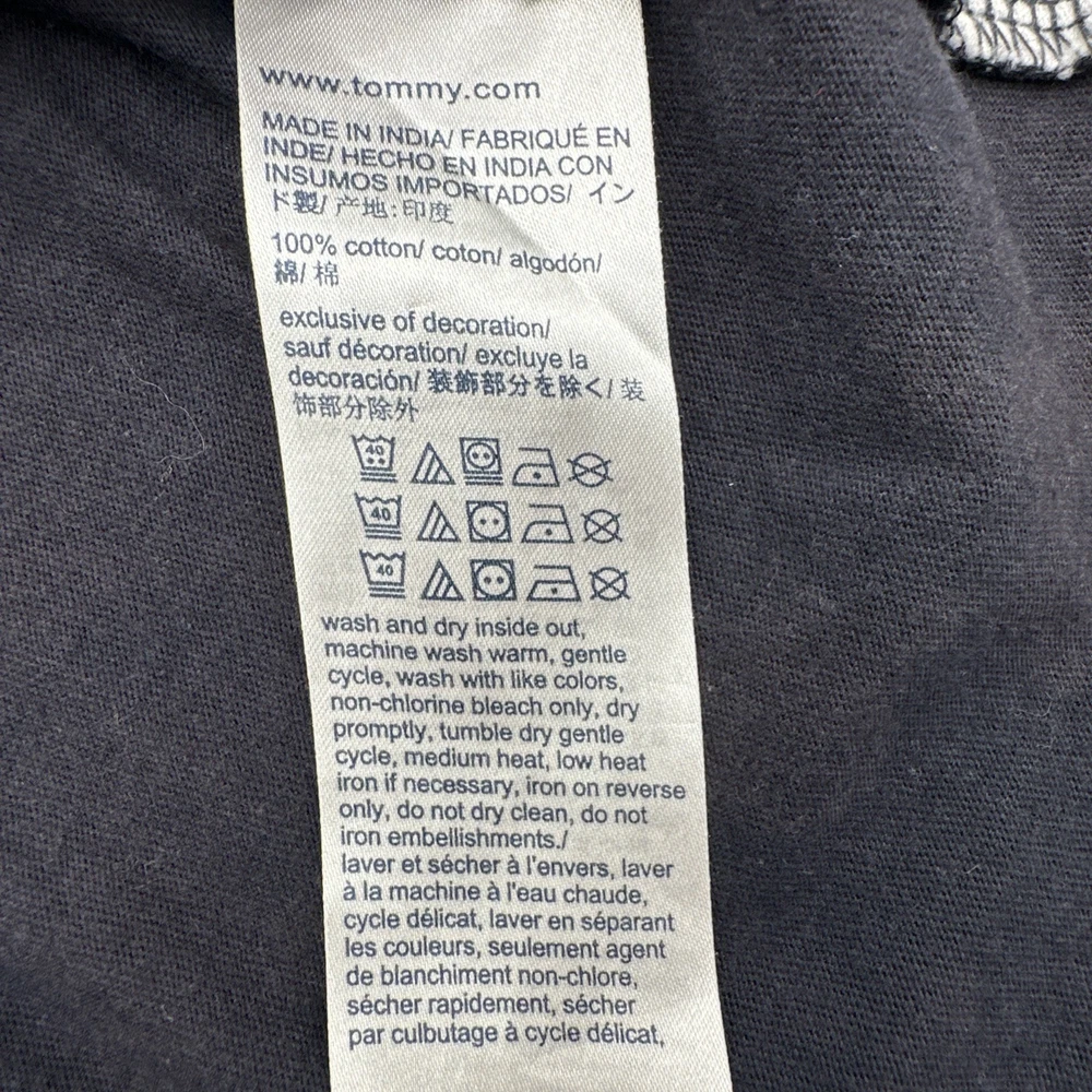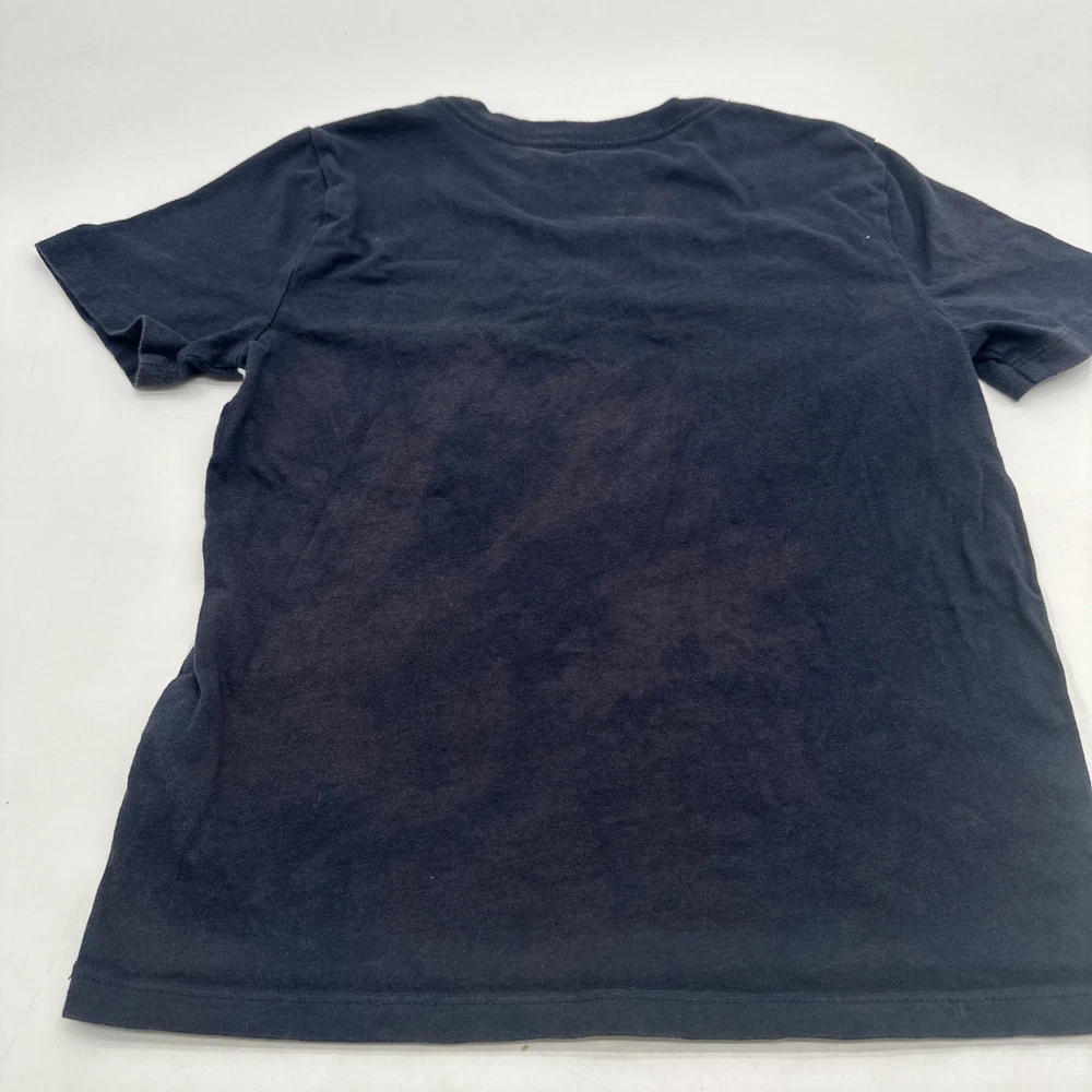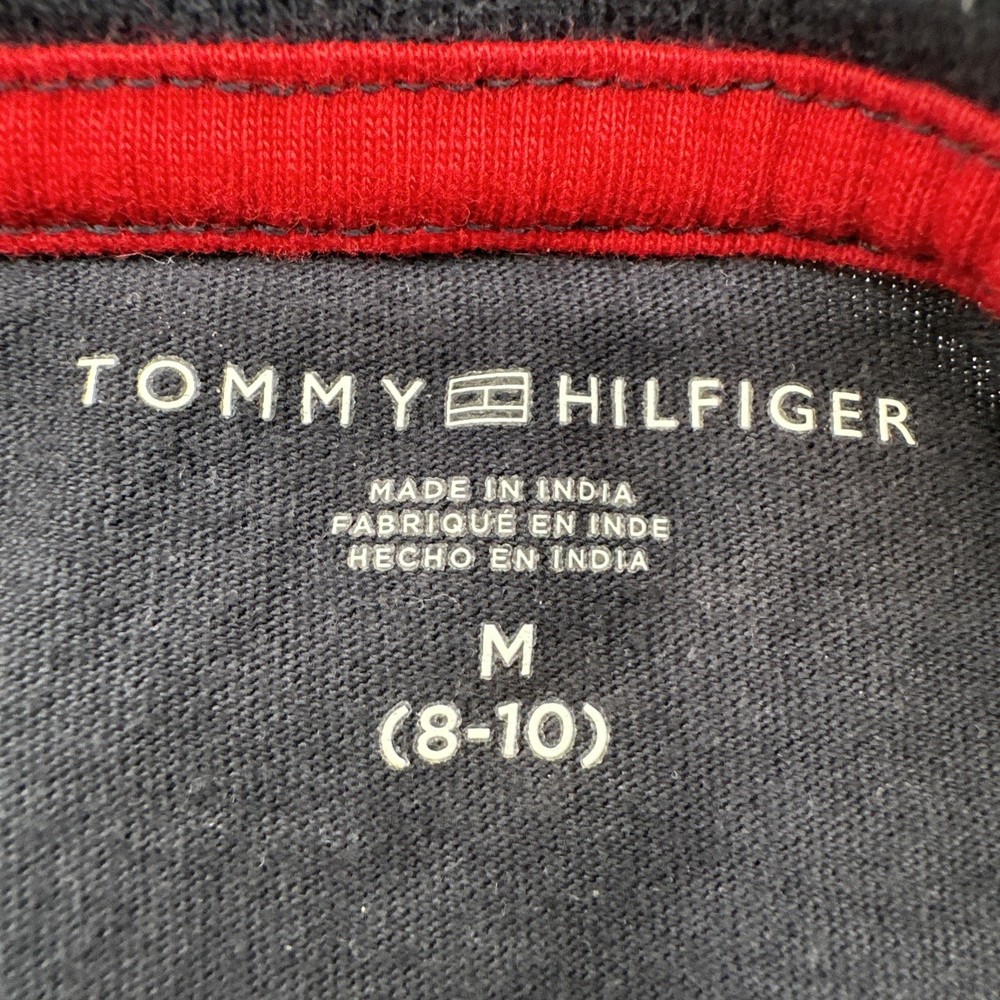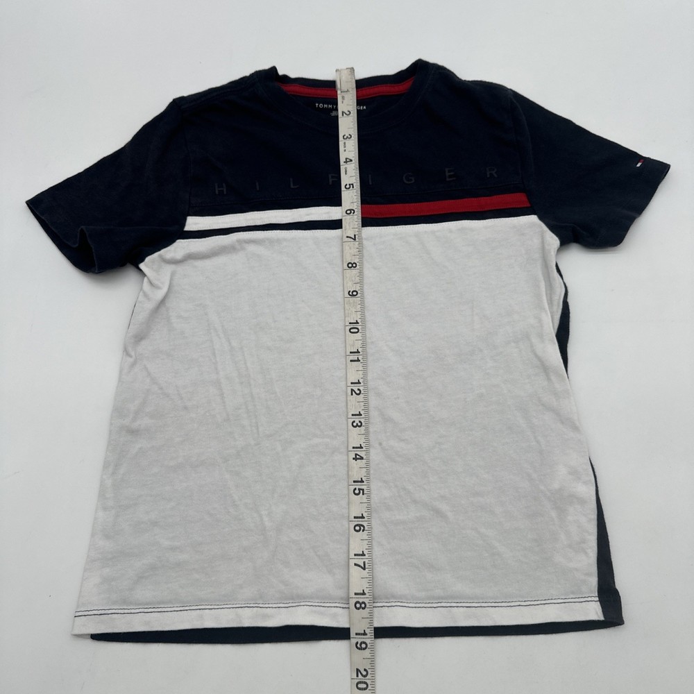 The Tommy Hilfiger T-shirt Youth Boy M 8-10 in Blue with Logo is a classic and stylish addition to any young boy's wardrobe. Made from 100% cotton fabric, this short sleeve shirt features a graphic print logo on the front, perfect for casual or formal occasions. With a comfortable crew neck and pullover closure, this regular fit shirt is suitable for all seasons and various activities such as walking, school, or even baseball. Ideal for travel, parties, or everyday wear, this Tommy Hilfiger T-shirt is a versatile and timeless piece for young boys. Check pictures for flaws and measurements