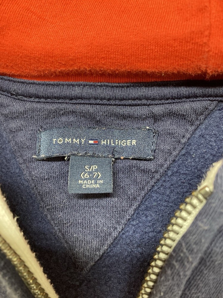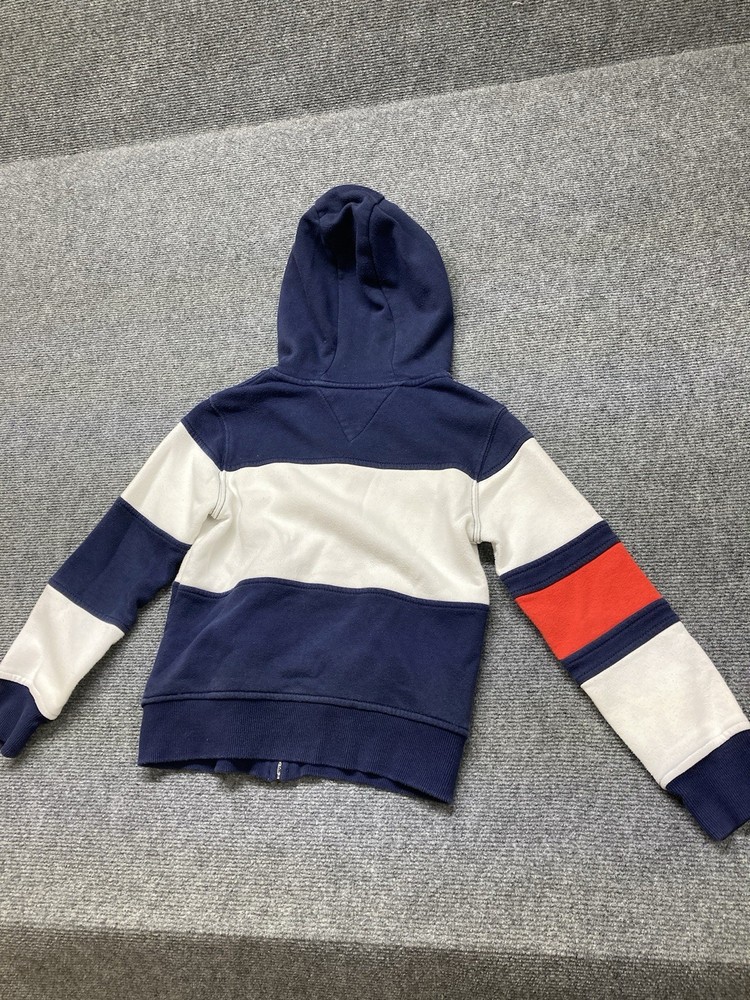 The Tommy Hilfiger Hoodie in Boys Size 6/7 is a stylish and comfortable choice for young boys. The patriotic colorblock pattern in red, white, and blue stands out, while the long sleeve and full zip closure make it practical for colder weather. Made from a soft cotton blend fleece, this hoodie is easy to care for with machine washable fabric. Ideal for travel, activewear, or casual occasions, this hoodie also features a hooded design and pockets for added convenience. Perfect for the winter, fall, or spring seasons, this hoodie is a versatile addition to any boy's wardrobe.