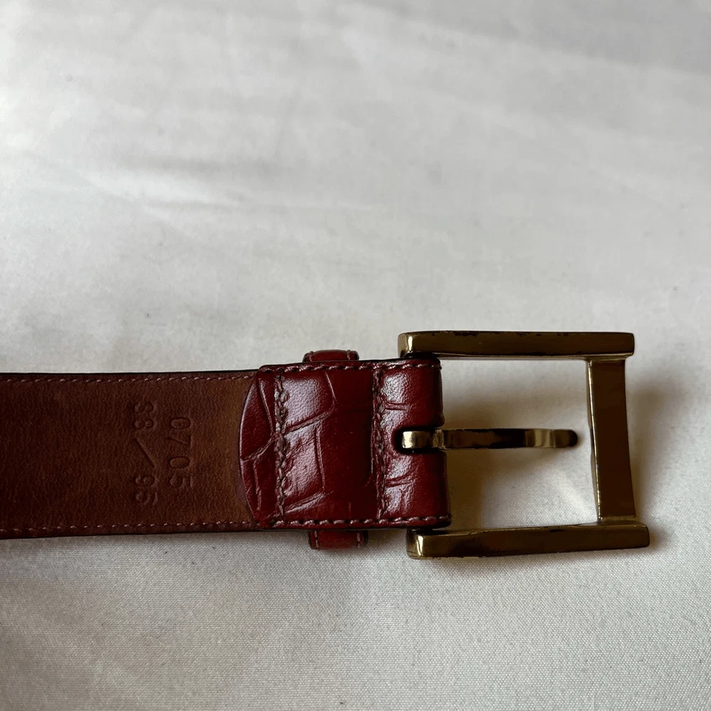 This belt is a fantastic find! The croc-embossed leather looks luxurious and feels durable, while the gold buckle adds a stylish touch. The cognac brown shade is versatile and pairs well with so many outfits. Love that it’s gently used but still in great condition—such a steal for a designer piece. The sizing is accurate, and the shipping was super fast. Highly recommend!