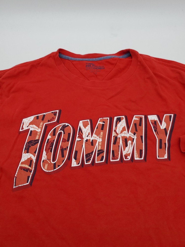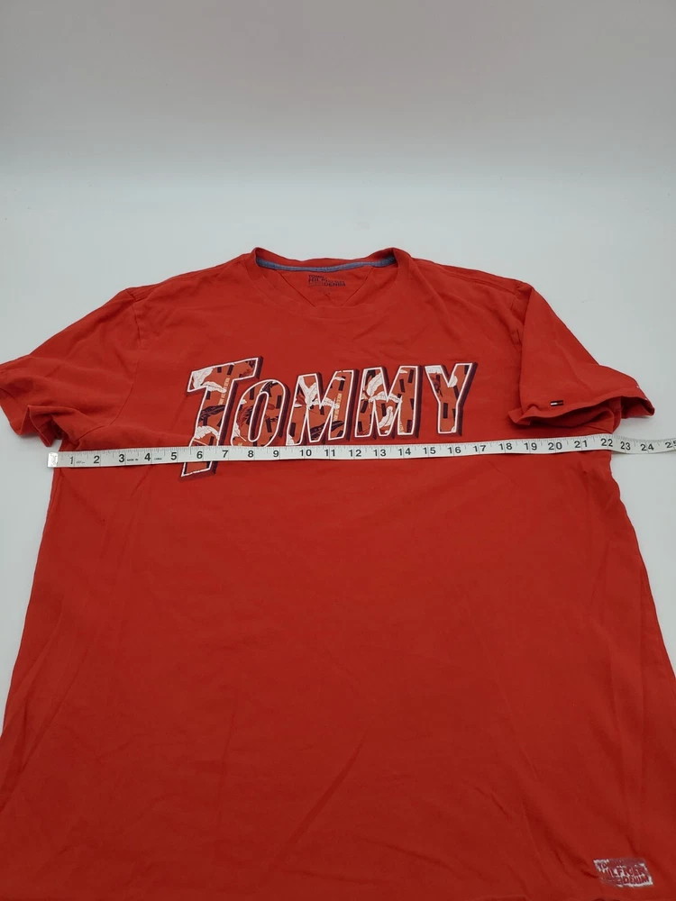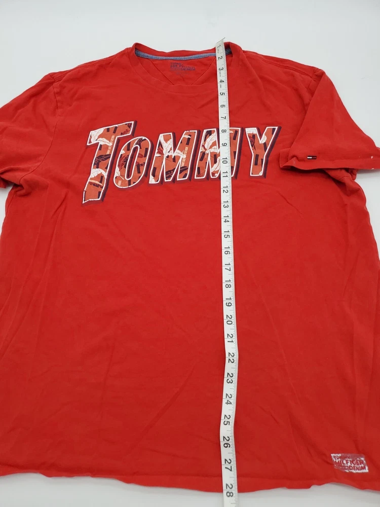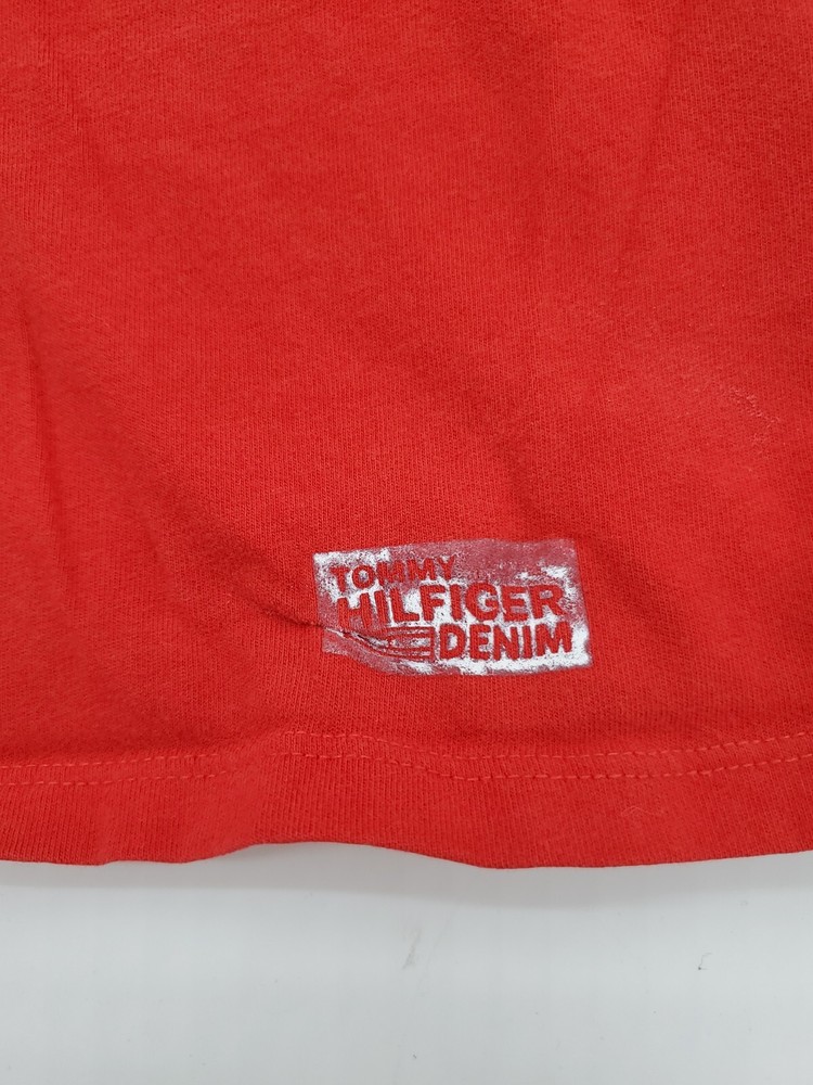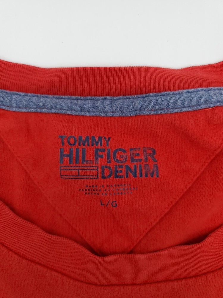 The Tommy Hilfiger Denim T-Shirt for men in size Large features a classic crew neck with a pullover closure, making it perfect for casual occasions. Made from 100% cotton, this red shirt with a graphic print logo is easy to care for and comfortable to wear. The Tommy Hilfiger brand and iconic logo accents add a touch of classic style to this wardrobe staple, perfect for everyday wear and walking activities. *Check the images above for the flaws and measurements of the item.